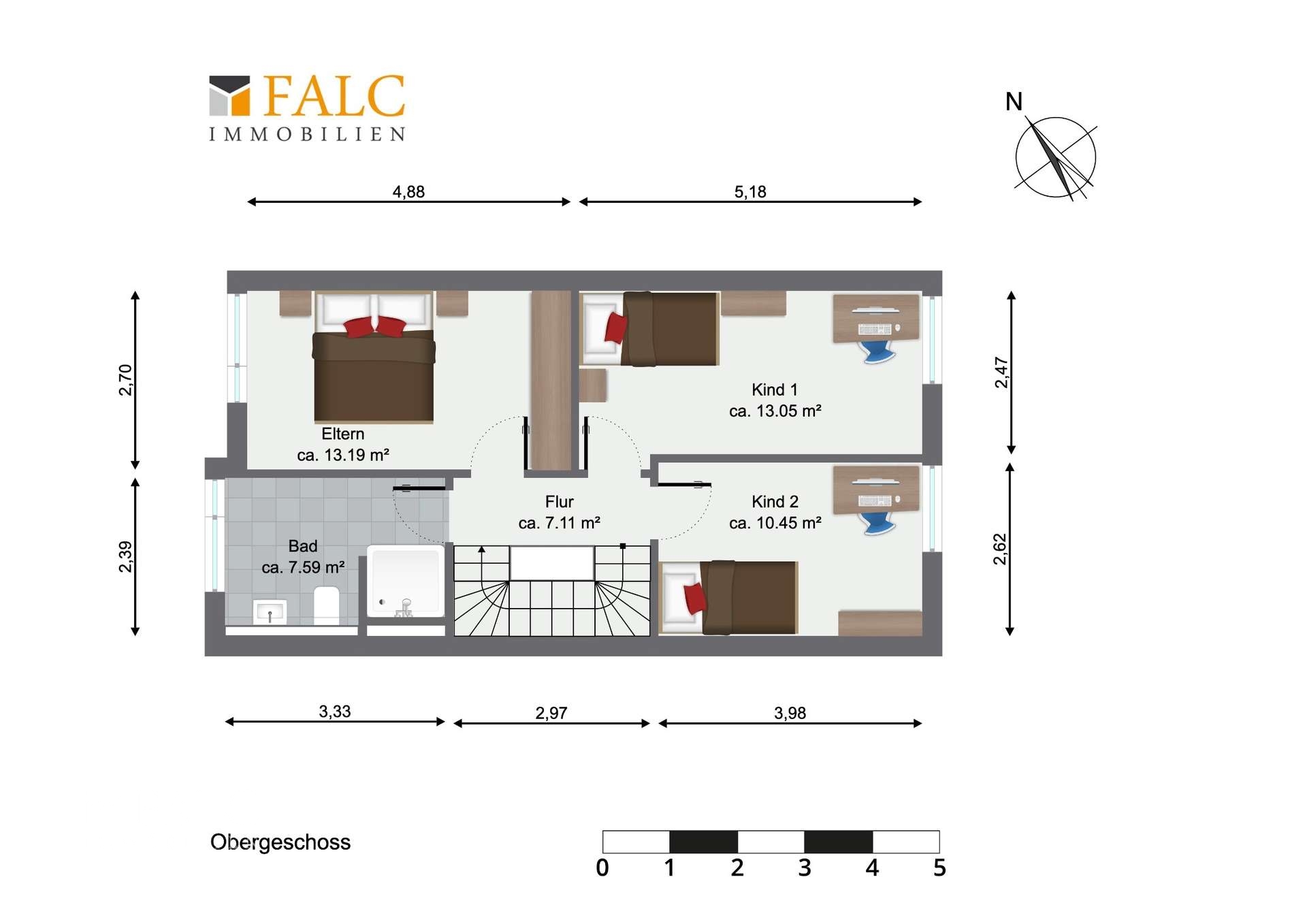 Über die Treppe im Wohnbereich gelangen Sie in das Obergeschoss, das sich hervorragend als Schlafebene eignet. Hier erwarten Sie drei Zimmer, die flexibel als Schlafzimmer, Kinderzimmer oder Büro genutzt werden können. Ergänzt wird diese Etage durch ein ca. 8 m² großes Badezimmer, dass ebenso wie die übrige Ausstattung des Hauses von Ihnen individuell gestaltet werden kann.