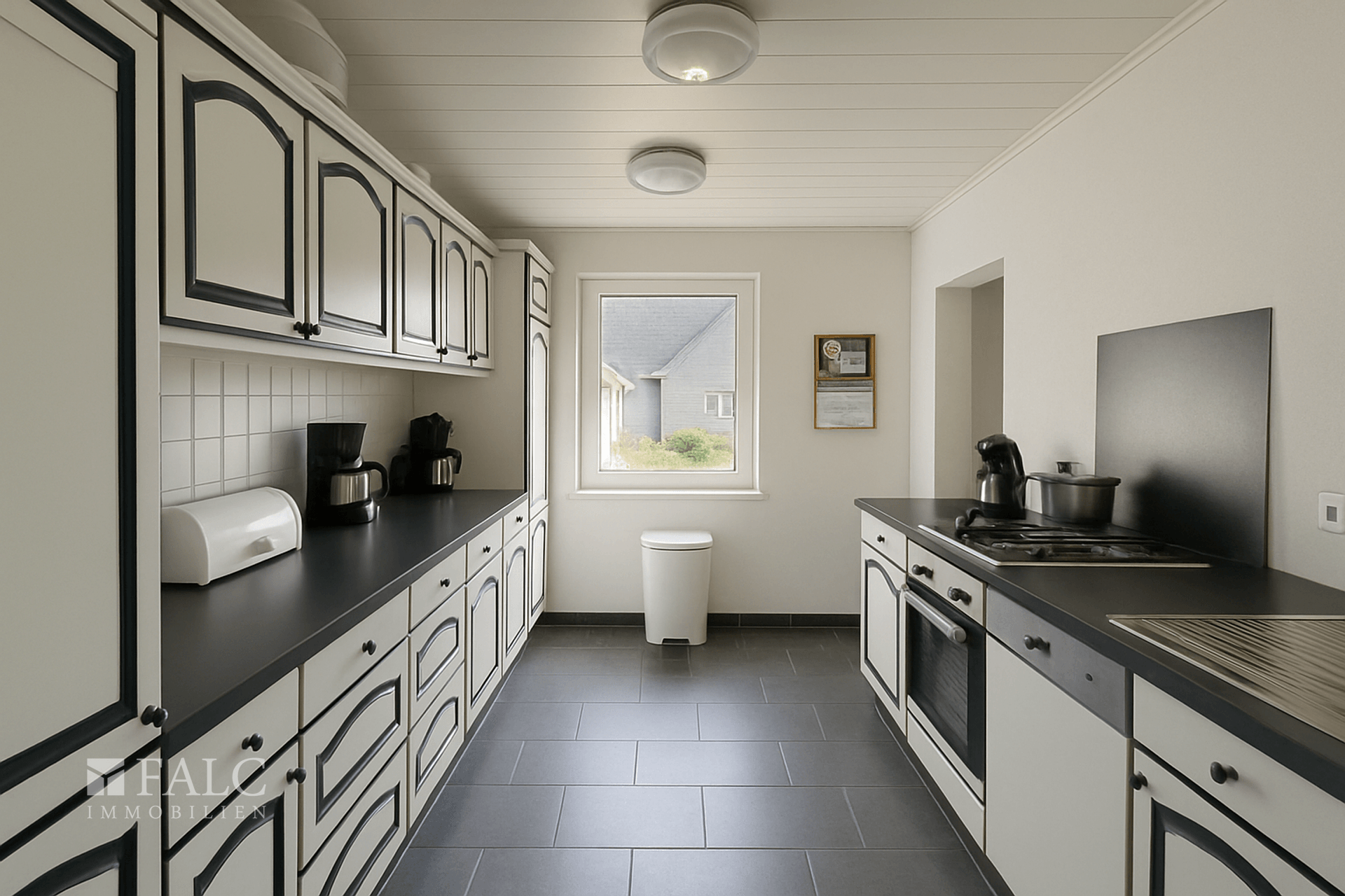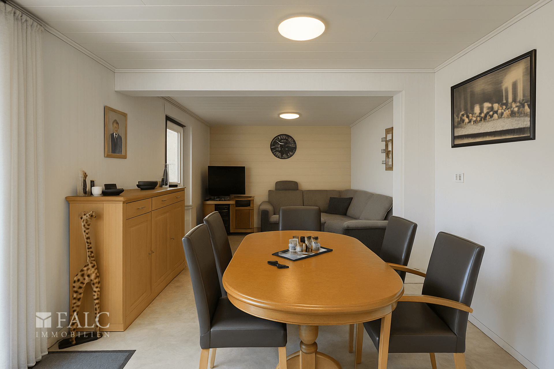 Der Wohnbereich bietet Ihnen bereits heute eine solide Grundlage und kann durch kluge Raumgestaltung und Ihre persönliche Handschrift zu einem lichtdurchfluteten Wohlfühlort werden. Die großen, doppelt verglasten Fenster aus 1990 sorgen für freundliches Tageslicht und schaffen eine warme Atmosphäre, die nur darauf wartet, von Ihnen voll entfaltet zu werden. Im Erdgeschoss befinden sich zudem die Küche, ein Gäste-WC sowie ein Tageslichtbad mit Badewanne und Dusche – funktional, charmant und offen für Ihre Ideen.