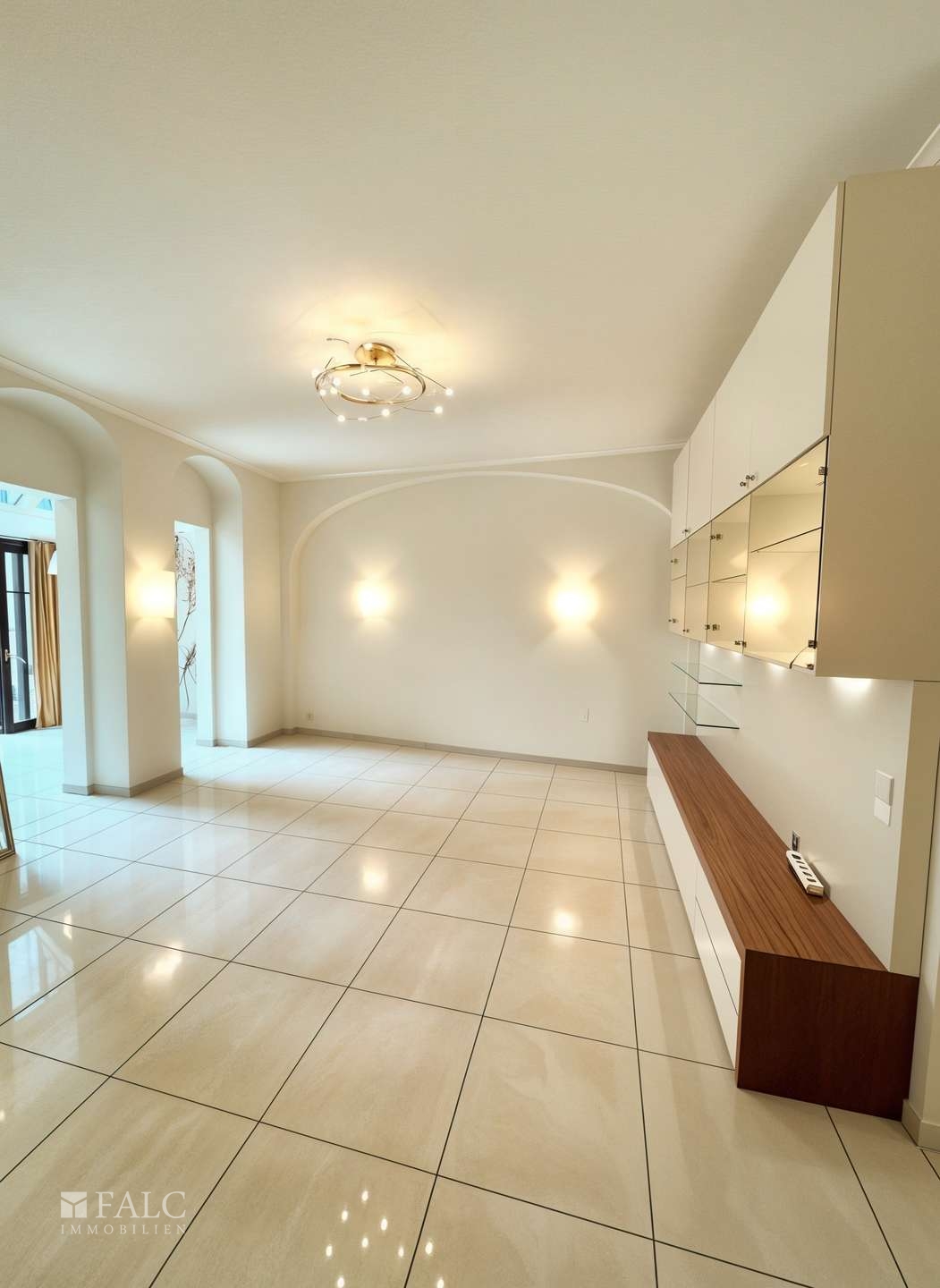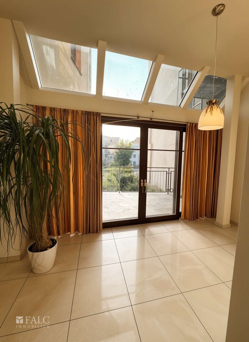 Weiter geht es in das großzügige Wohnzimmer, das mit einem angrenzenden Wintergarten beeindruckt. Der Wintergarten bietet Zugang zur Terrasse, die einen ruhigen Rückzugsort im Freien darstellt. Die großen Fenster lassen viel Licht herein und schaffen eine helle, freundliche Atmosphäre.