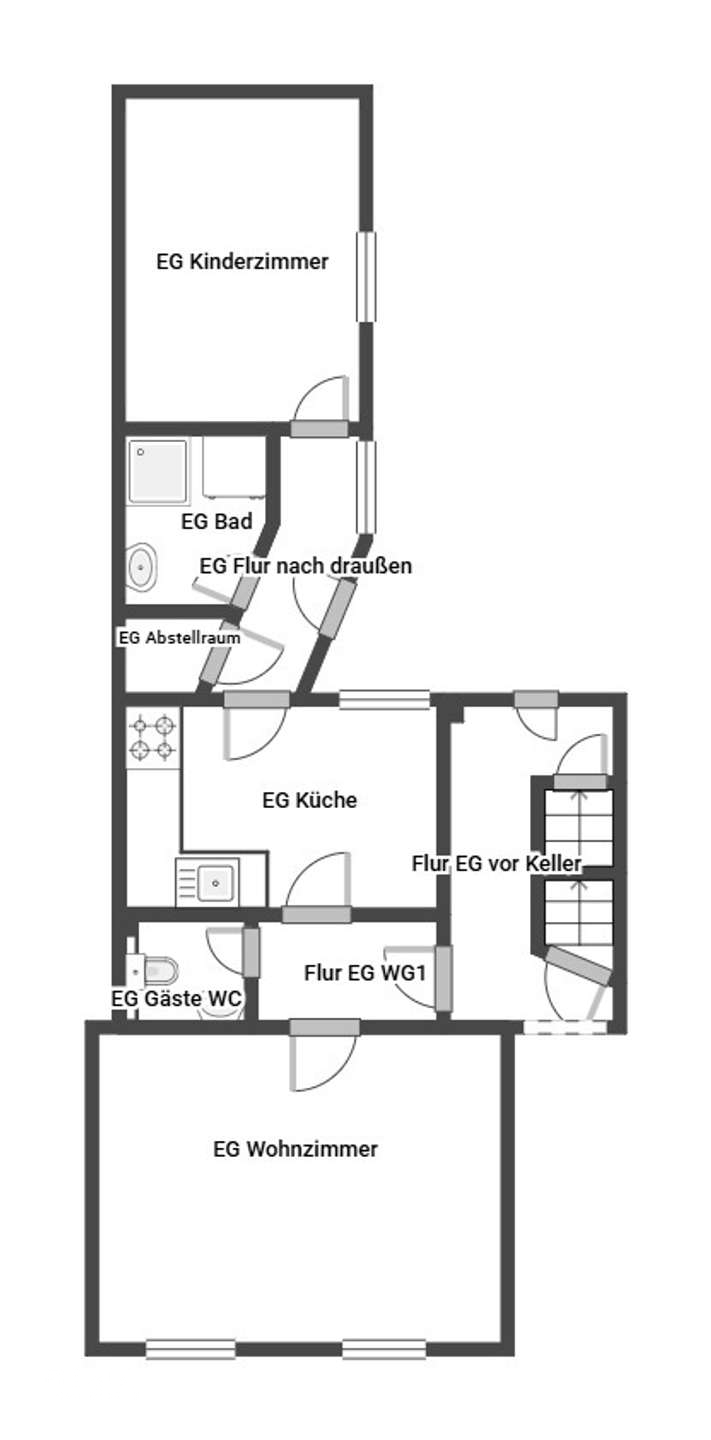 Von der Diele aus gelangen Sie in die erste Wohnung, links befindet sich das großzügige schöne helle Wohnzimmer, mit Laminatboden in Holzoptik. Die moderne Küche ist funktional gestaltet und bietet ausreichend Platz für gemeinsame Kochabende. Ein Gäste-WC im Erdgeschoss sorgt für zusätzlichen Komfort, ein nützlicher Abstellraum, ein Bad, sowie das Kinderzimmer runden die untere Wohnung ab.