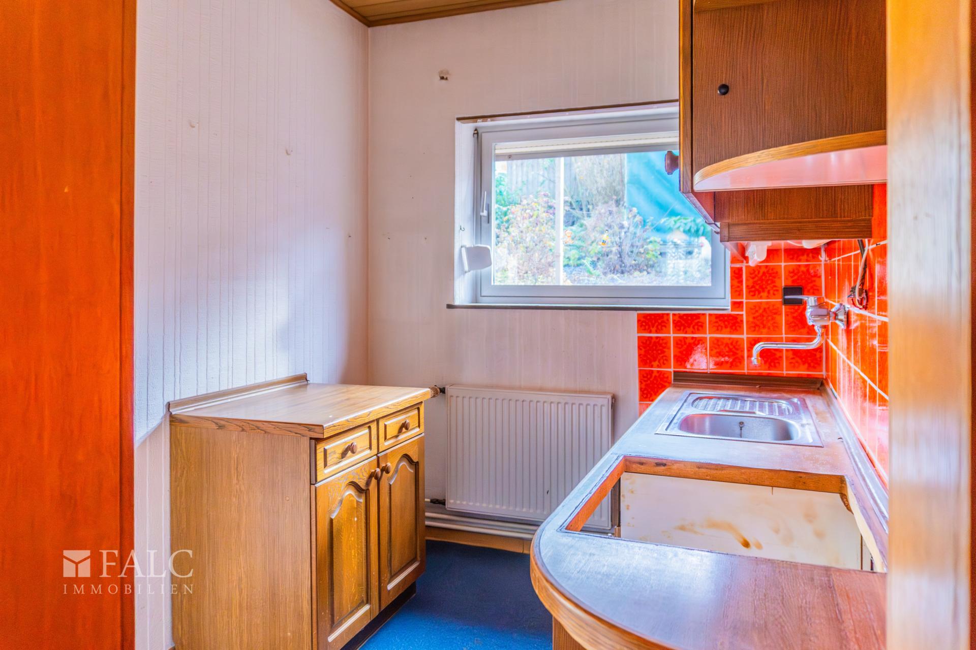 An das Wohnzimmer und Esszimmer schließt sich die Küche an, die mit rustikalen Holzmöbeln und einem nostalgischen Fliesenspiegel ausgestattet ist. Hier finden Sie ausreichend Platz für einen kleinen Frühstückstisch, an dem die Familie zusammenkommen kann.