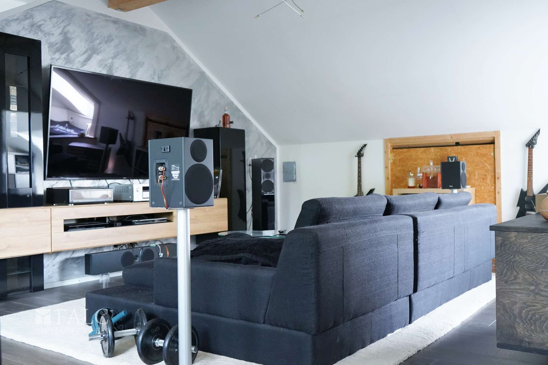 Der Dachboden wurde zu einem weitläufigen Studio ausgebaut. Im Außenbereich erwartet Sie ein geräumiges Carport mit einer separaten, großen Abstellkammer sowie ein weiterer Stellplatz, der zusätzlichen Komfort bietet.
