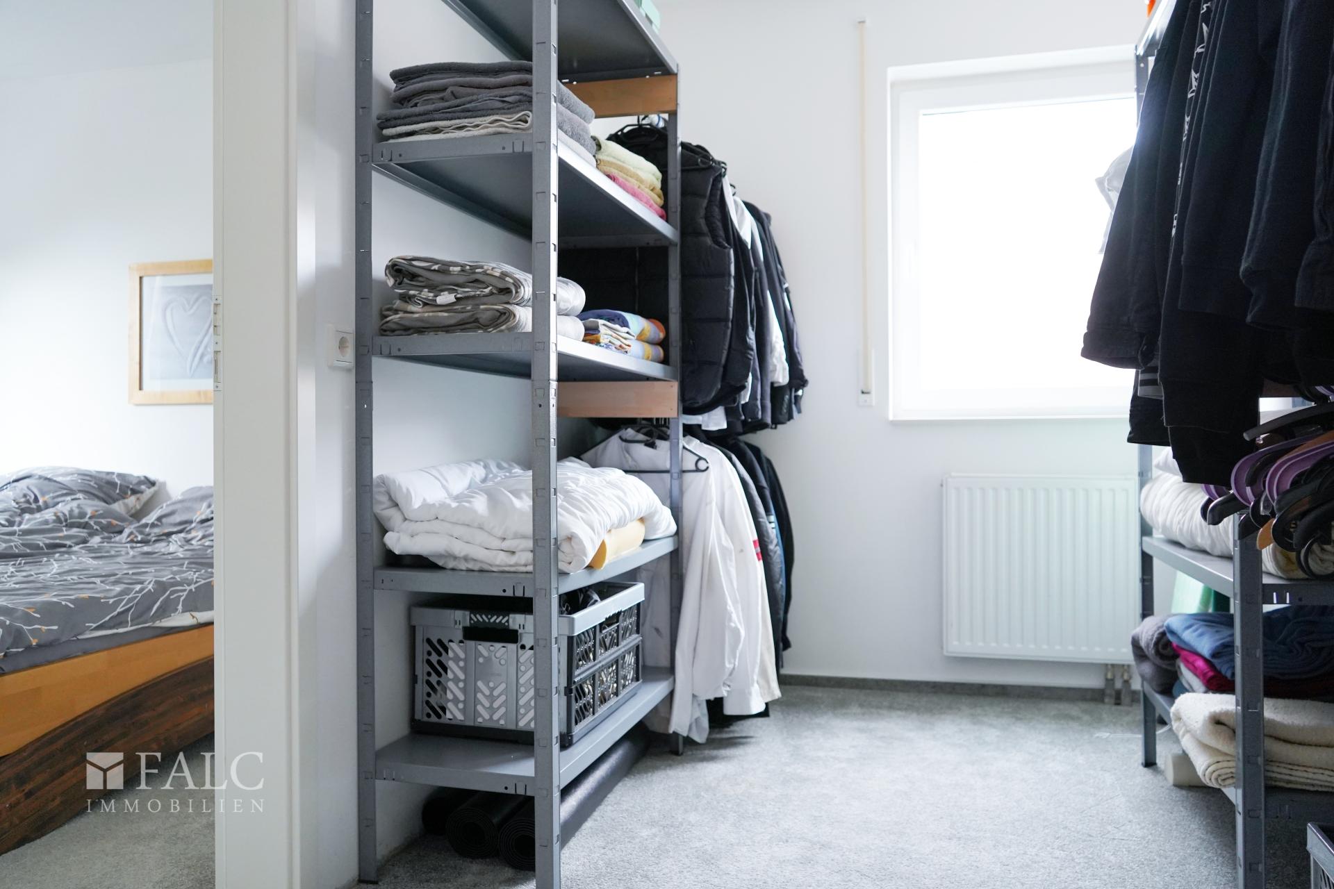 Ein Gäste-WC im Erdgeschoss sorgt für zusätzlichen Komfort. Über eine stilvolle Treppe erreichen Sie das Obergeschoss, wo sich ein Schlafzimmer mit Ankleidezimmer und ein sehr großes Kinderzimmer befinden, das ebenfalls durch eine Trennwand in zwei Räume unterteilt werden kann. Diese bieten ausreichend Platz für die ganze Familie und sind flexibel nutzbar. Das Hauptbadezimmer ist modern und mit einer Badewanne sowie einer separaten, bodendentiefen Dusche ausgestattet.