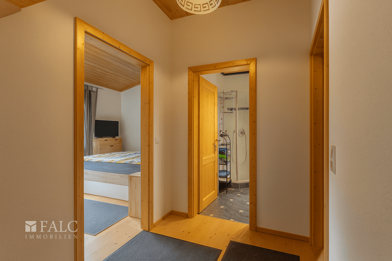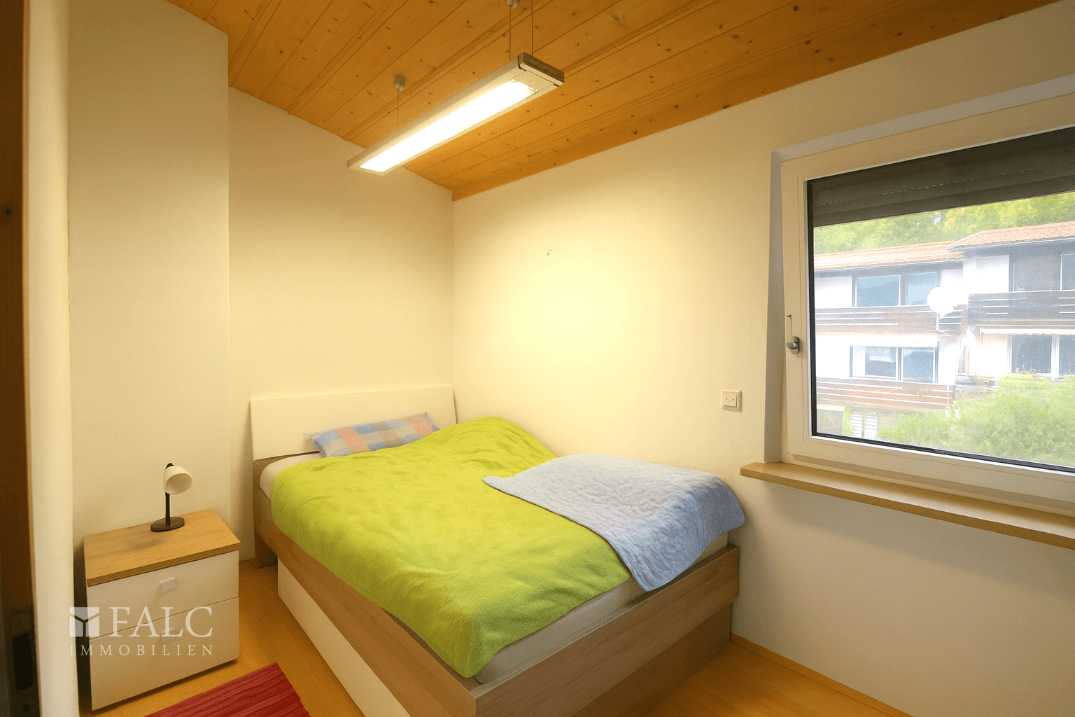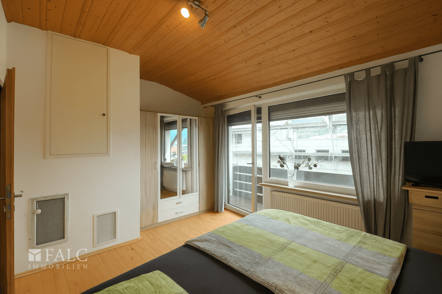 Im Obergeschoss befindet sich das ruhig gelegene Schlafzimmer, das als perfekter Rückzugsort dient. Von hier aus gelangen Sie direkt auf den überdachten Balkon, der einen schönen Ausblick ins Grüne bietet.