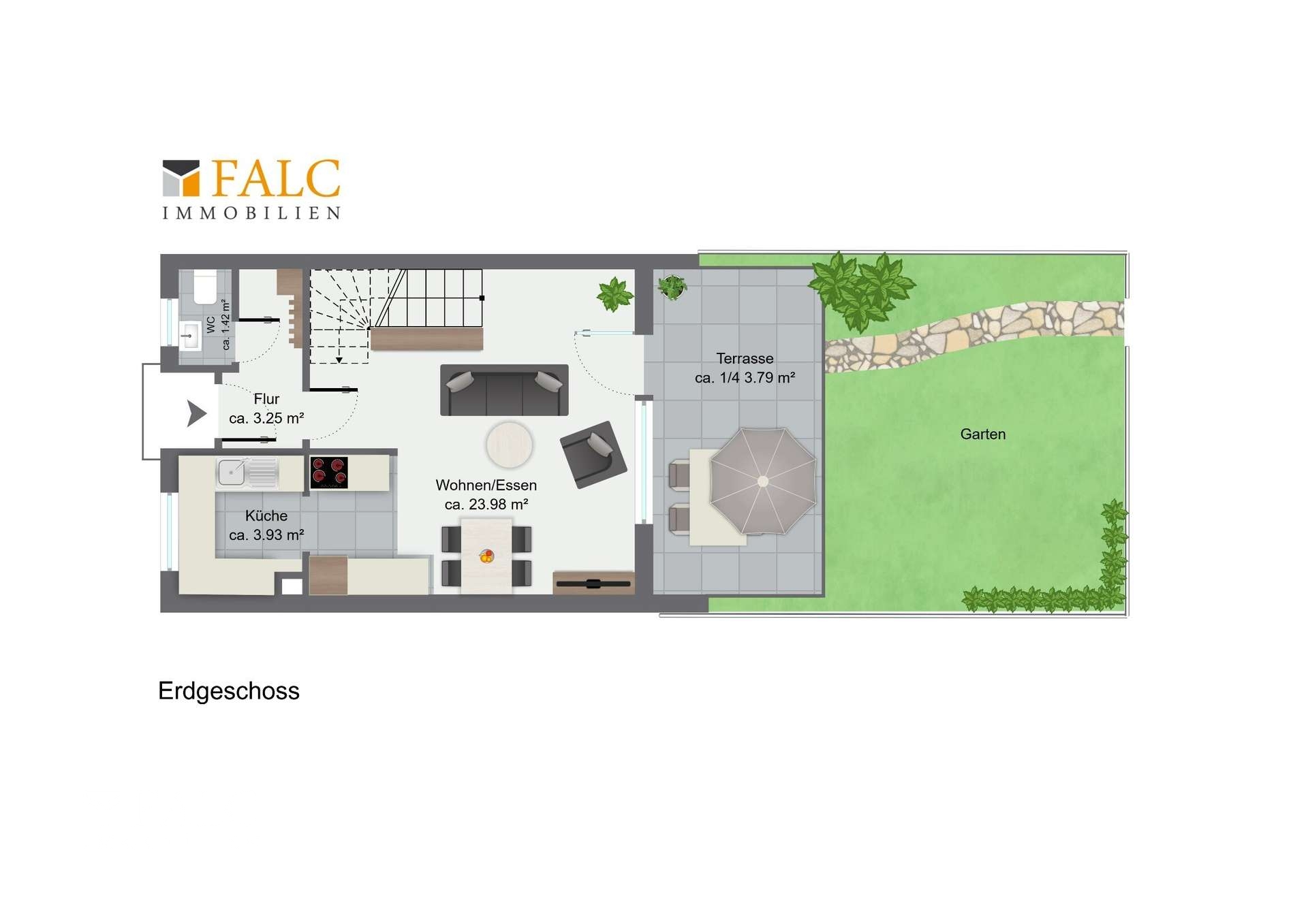 Der liebevoll angelegte Garten ist direkt vom Wohnzimmer aus erreichbar. Er bietet Raum zum Entspannen, Spielen oder Gärtnern – eine kleine grüne Oase, in der Sie zur Ruhe kommen können.