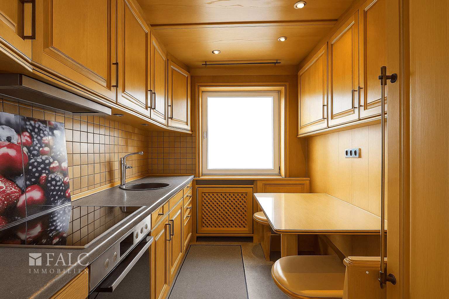 Direkt angrenzend befindet sich die Küche, die ebenfalls mit maßgefertigten Schreinerarbeiten ausgestattet ist. Ein kleiner Esstisch bietet Platz für gemeinsame Mahlzeiten.