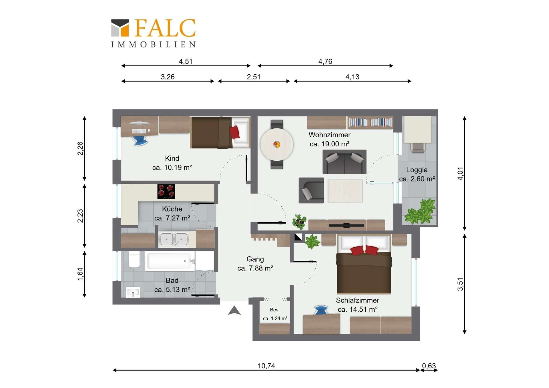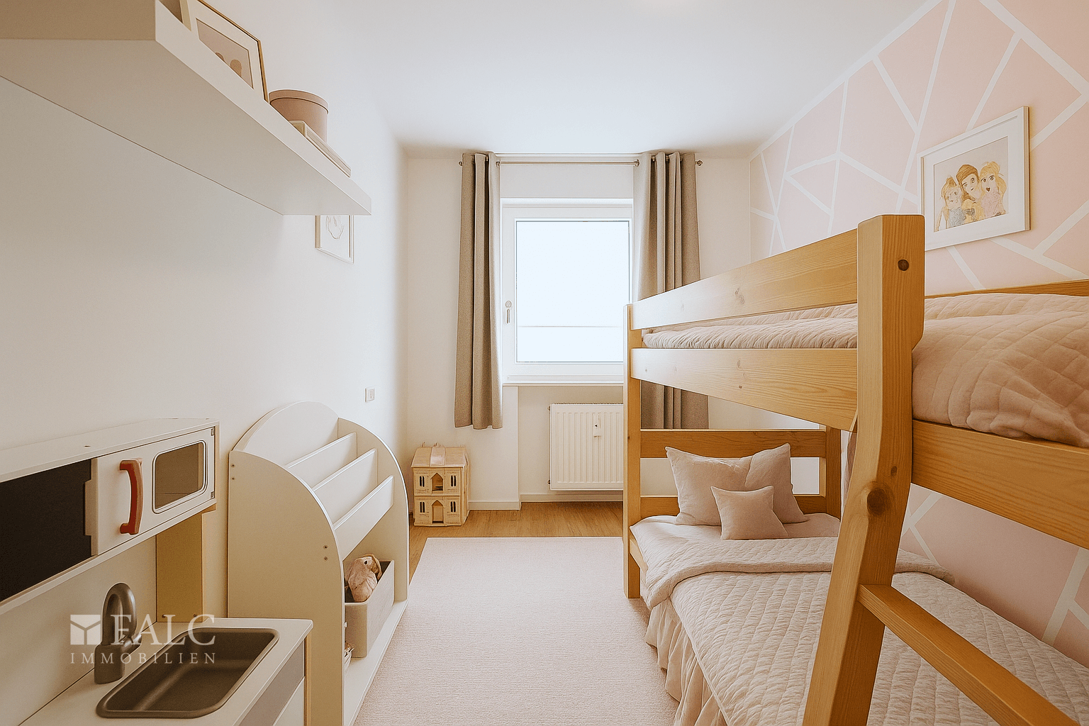 Das großzügige Wohnzimmer ist das Herzstück der Wohnung. Große Fensterflächen sorgen für reichlich Tageslicht und eine freundliche Atmosphäre. Der Raum bietet ausreichend Platz für eine gemütliche Sofalecke sowie einen Esstisch, an dem die ganze Familie zusammenkommen kann.
