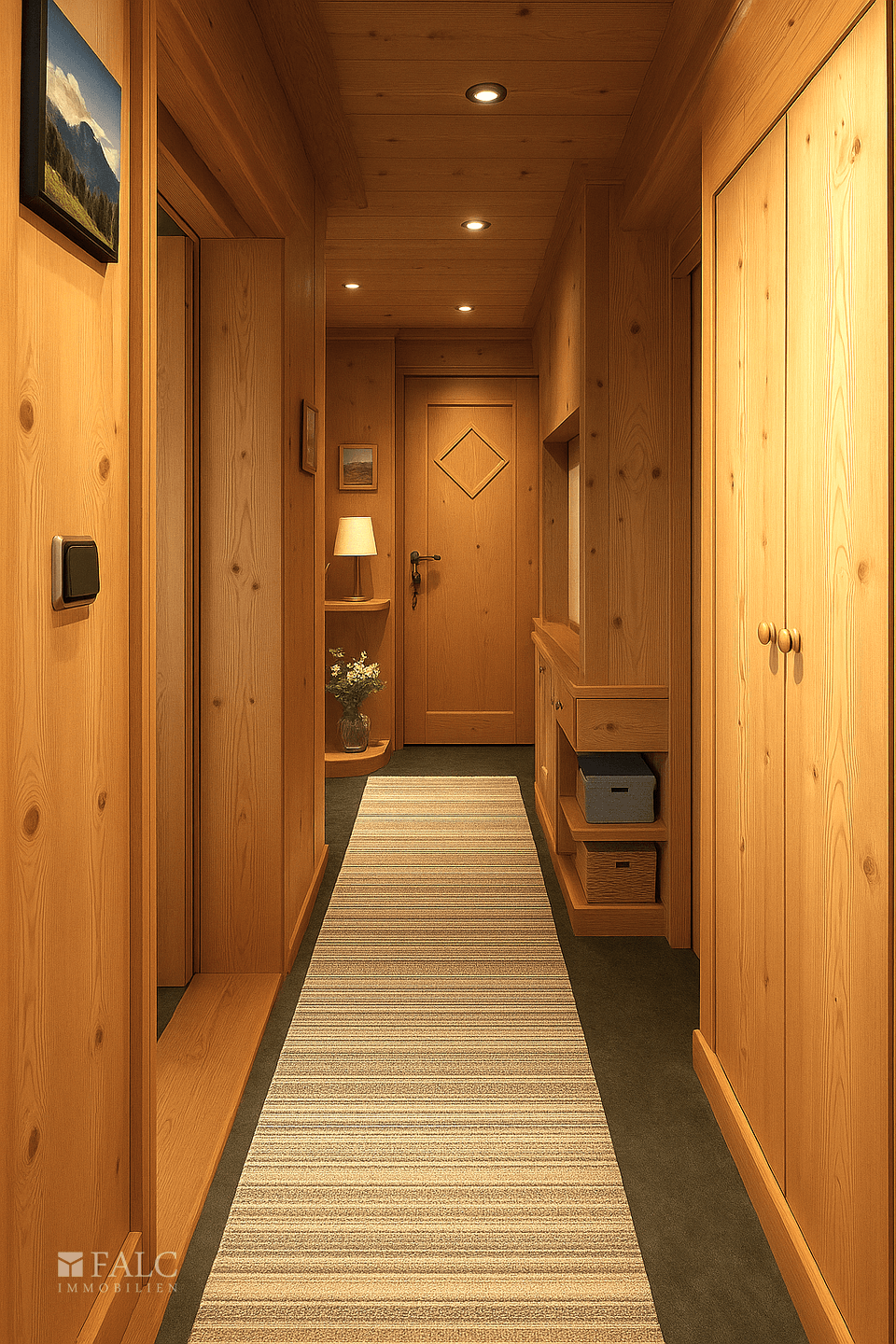 Beim Betreten der Wohnung empfängt Sie ein einladender Flur, der zentralen Zugang zu allen Räumen gewährt. Bereits hier zeigt sich die besondere Liebe zum Detail: Maßgefertigte Einbauschränke für Jacken und Schuhe, rustikale Holztüren, eine Holzdecke sowie eine beleuchtete Vitrine sorgen für ein stimmiges Entree. Sie spiegeln das traditionelle Flair des bayerischen Oberlands wider und verleihen dem Zuhause eine warme, wohnliche Atmosphäre.