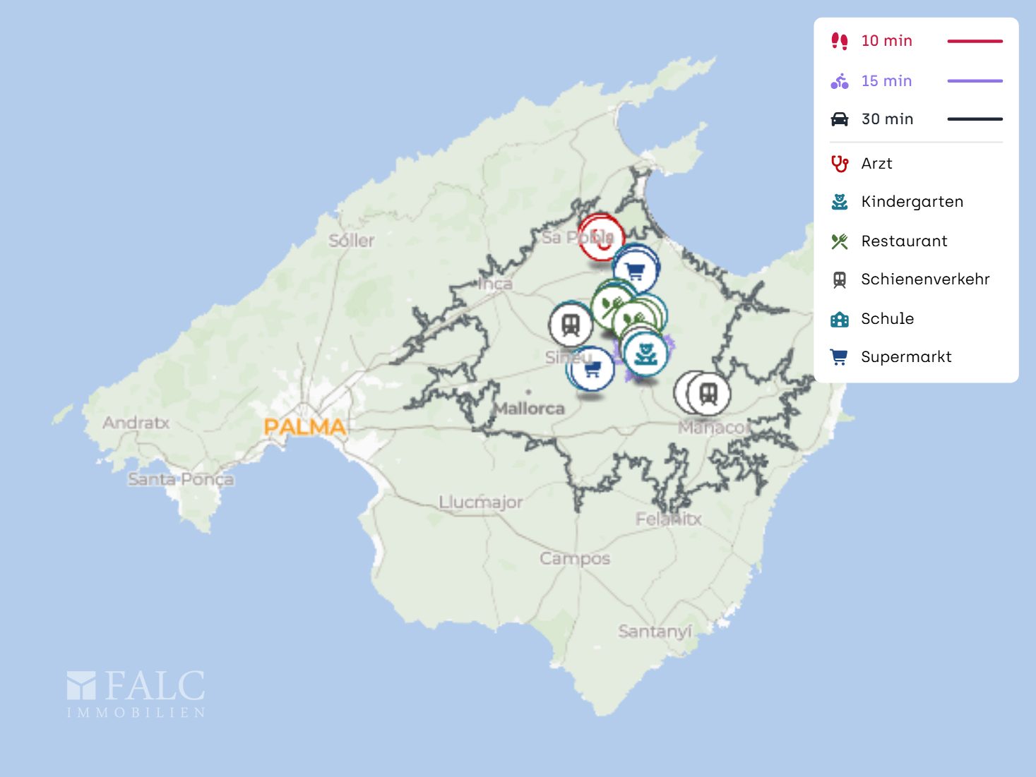 Trotz der ruhigen Umgebung ist eine gute Anbindung gewährleistet. Die umliegenden Orte wie Petra, Sineu oder Manacor sind schnell erreichbar und bieten eine umfassende Infrastruktur mit Einkaufsmöglichkeiten, Restaurants, Wochenmärkten und medizinischer Versorgung.