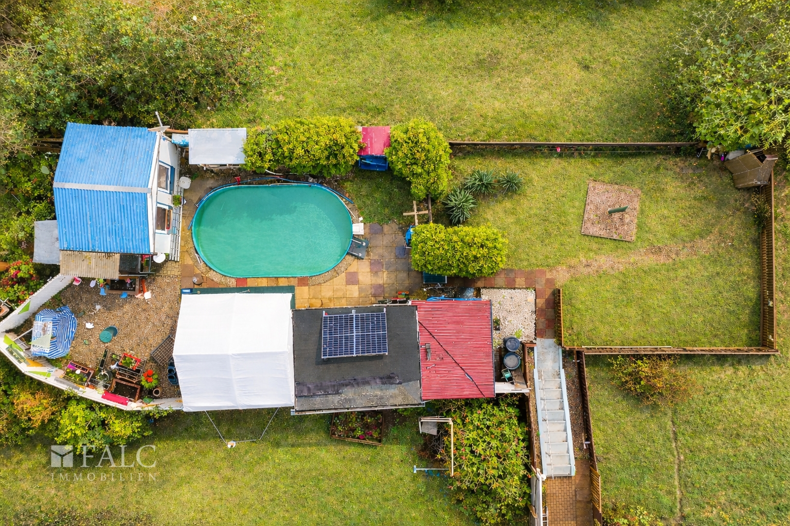 Der Garten mit Pool, Sommerlaube und großzügigem Schuppen liegt nur wenige Schritte vom Wohnhaus entfernt und bietet einen besonders ruhigen, geschützten Bereich für Freizeit, Entspannung und Familienleben.