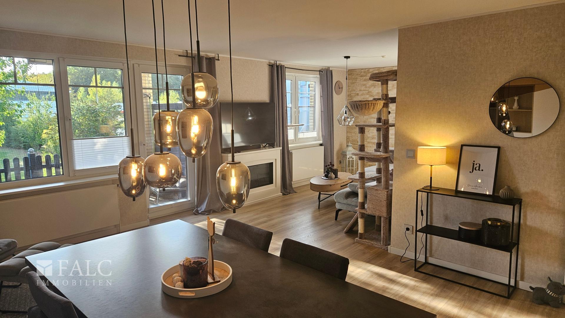 Nach einem weiteren rechtsseitig gelegenem Zimmer, erreichen Sie den großen, warmen Wohn-/ Esszimmerbereich mit Zugang zur Terrasse und einem nicht einsehbaren Garten.