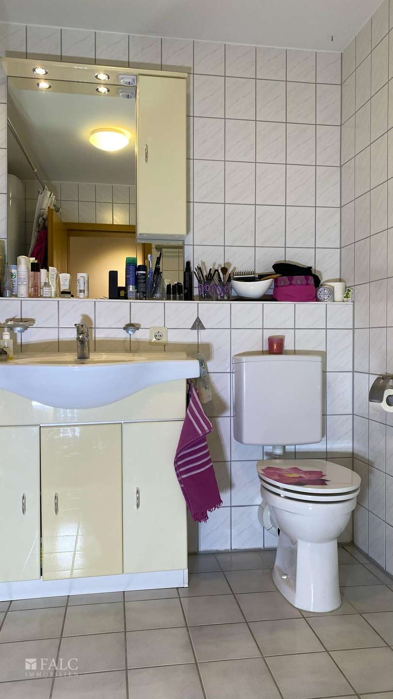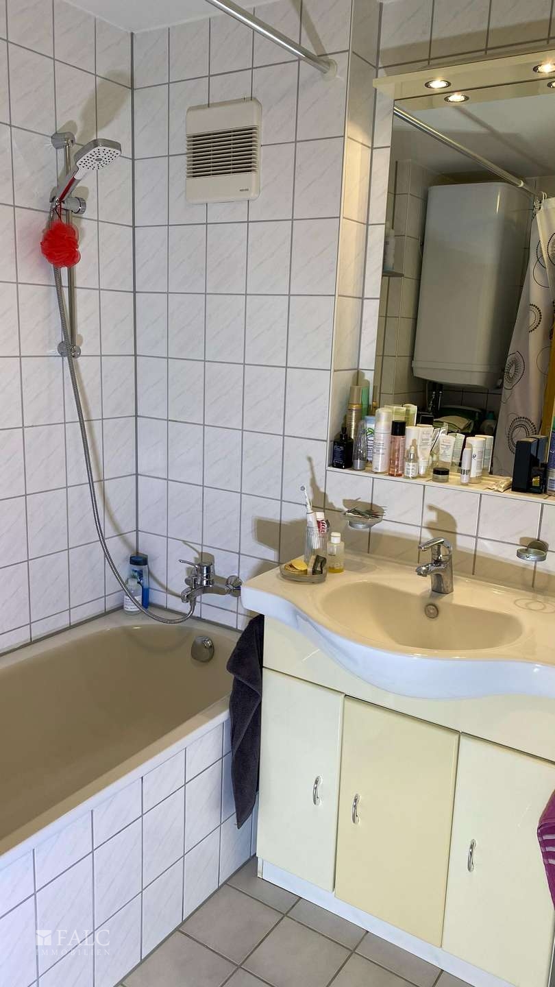 Das Badezimmer ist funktional ausgestattet und verfügt über eine Badewanne mit Duschfunktion, ein Waschmaschinenplatz sowie Waschbecken und Toilette. Zusätzlich gibt es ein praktisches Gäste-WC mit einer weiteren Toilette und Waschbecken.