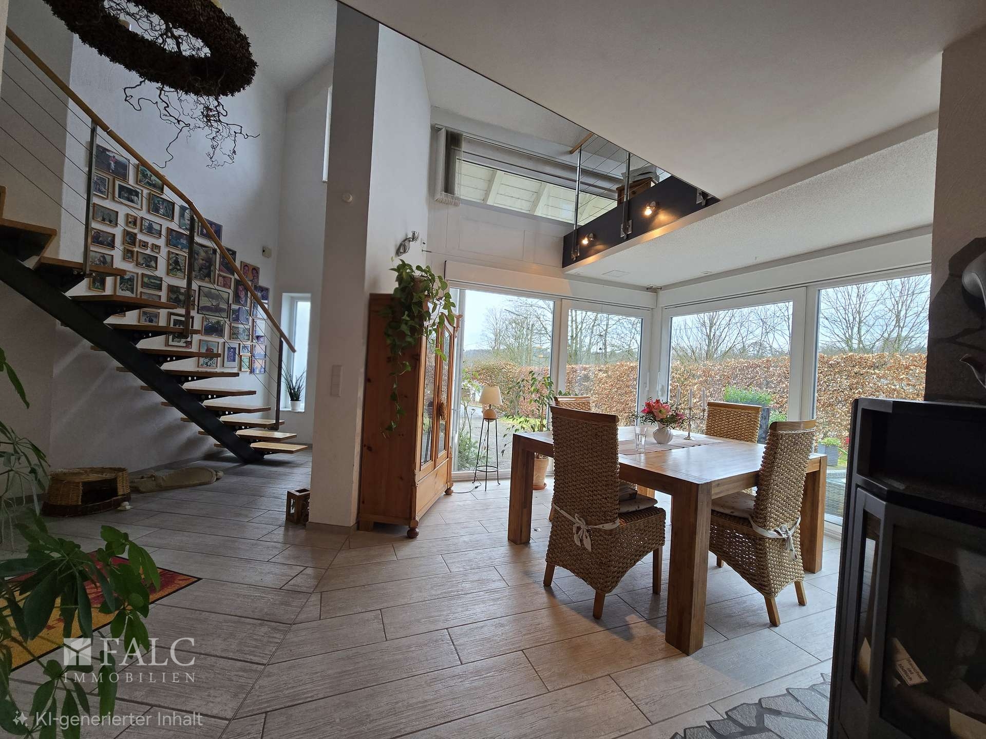 Bereits beim Ankommen überzeugt der stimmige Gesamteindruck: eine ansprechende Außenansicht, ein einladender Eingangsbereich und ein Treppenhaus, das durch die offene Gestaltung und die Galerie ein luftiges Ambiente schafft. Im Erdgeschoss bildet der Wohnbereich das Herzstück des Hauses. Große Fensterflächen sorgen für viel Tageslicht und schaffen eine angenehme Verbindung nach draußen. Der Wohn und Essbereich wirkt offen und kommunikativ, gleichzeitig sind die Bereiche gut zoniert. Ein Kaminofen ergänzt das Wohngefühl und macht den Raum besonders in der kühleren Jahreszeit zu einem gemütlichen Mittelpunkt.