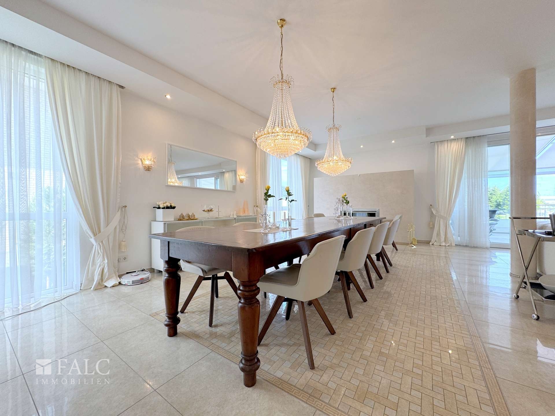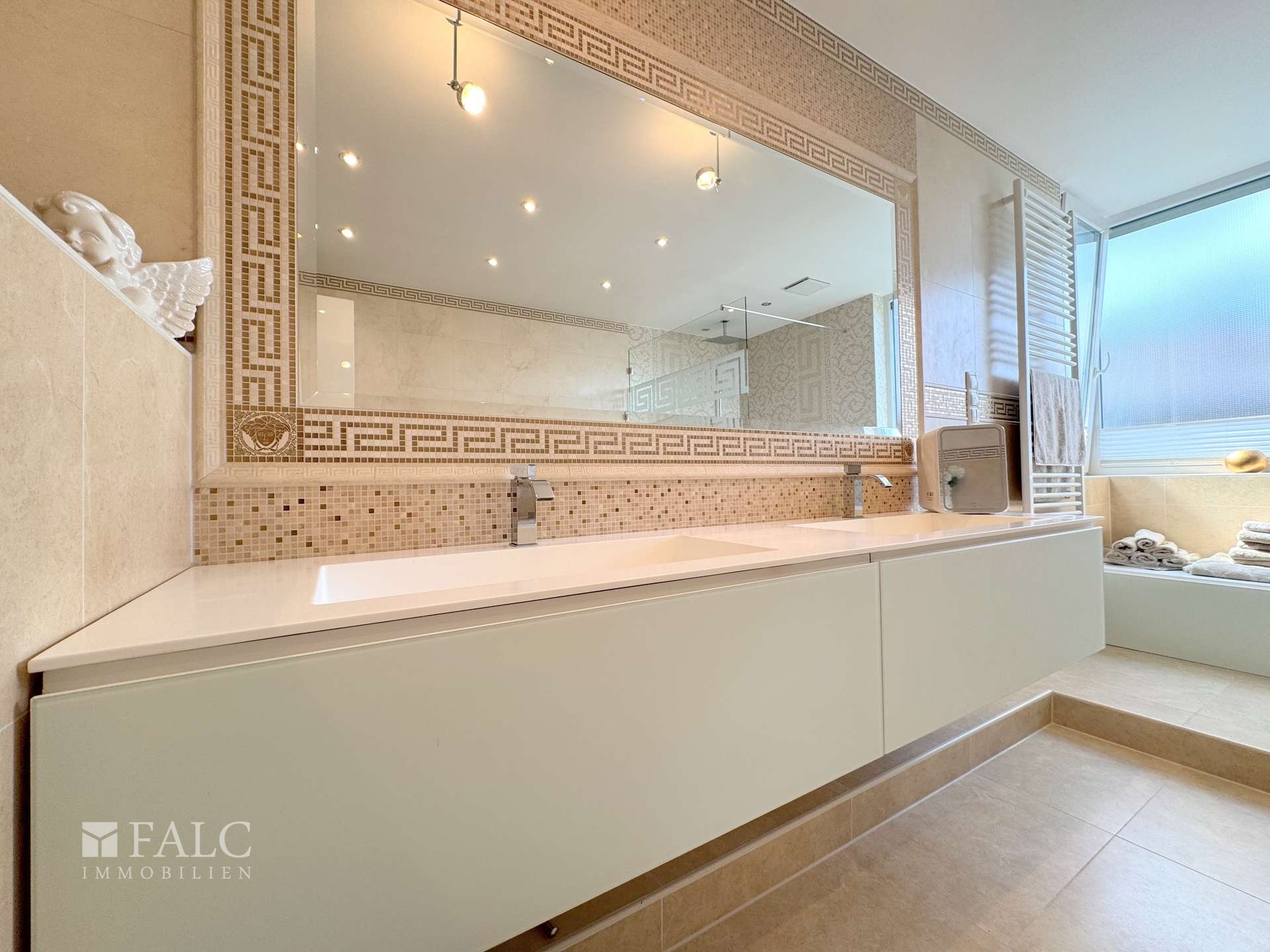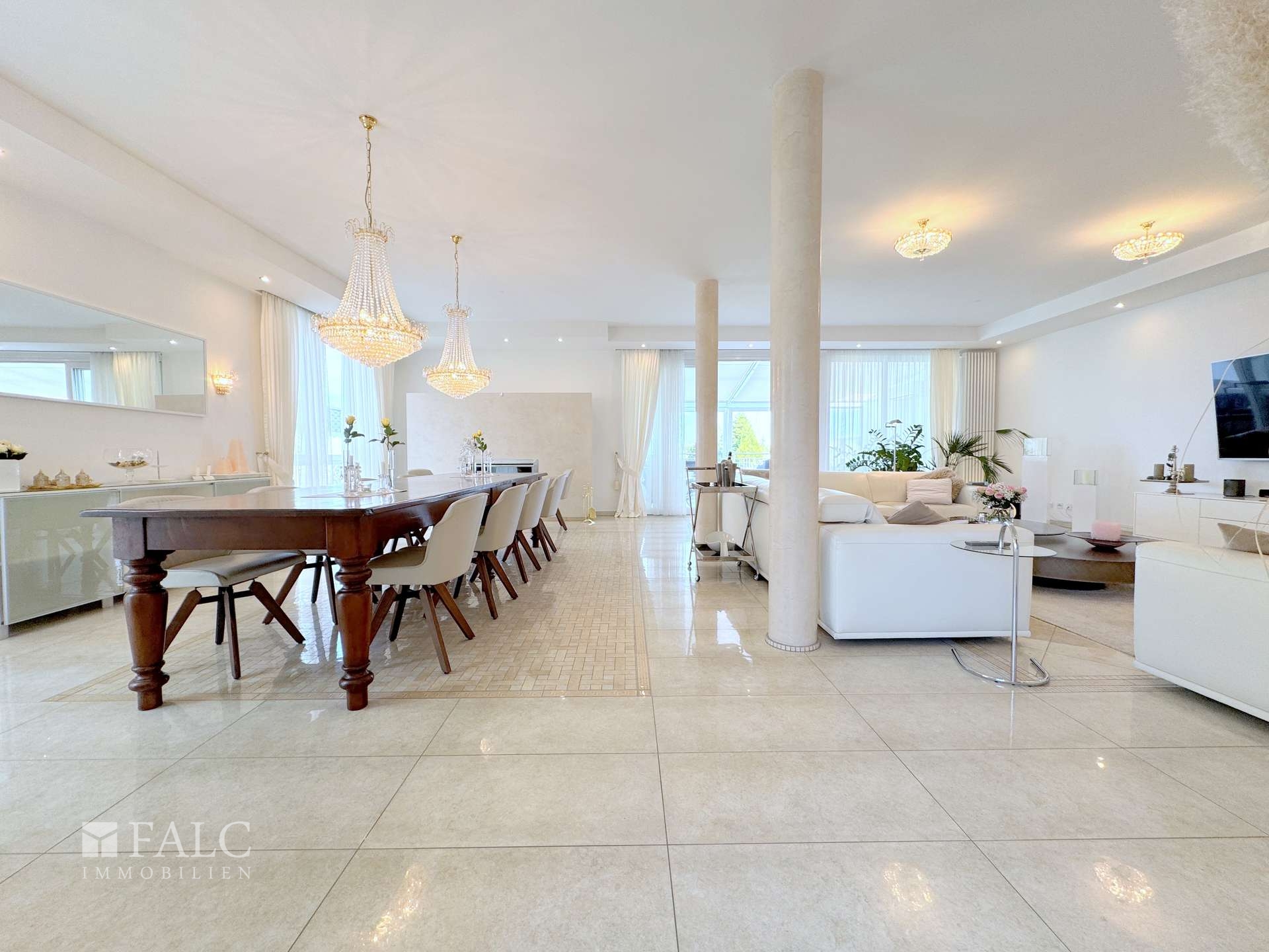 Die Hauptwohnung mit ca. 370 m² Wohnfläche erstreckt sich über Erd- und Obergeschoss und besticht durch ein durchdachtes Raumkonzept sowie exklusive Ausstattung. Hochwertige Fliesen in nahezu allen Bereichen – teilweise edelste Materialien aus Italien – verleihen der Wohnung ein elegantes, modernes Ambiente.