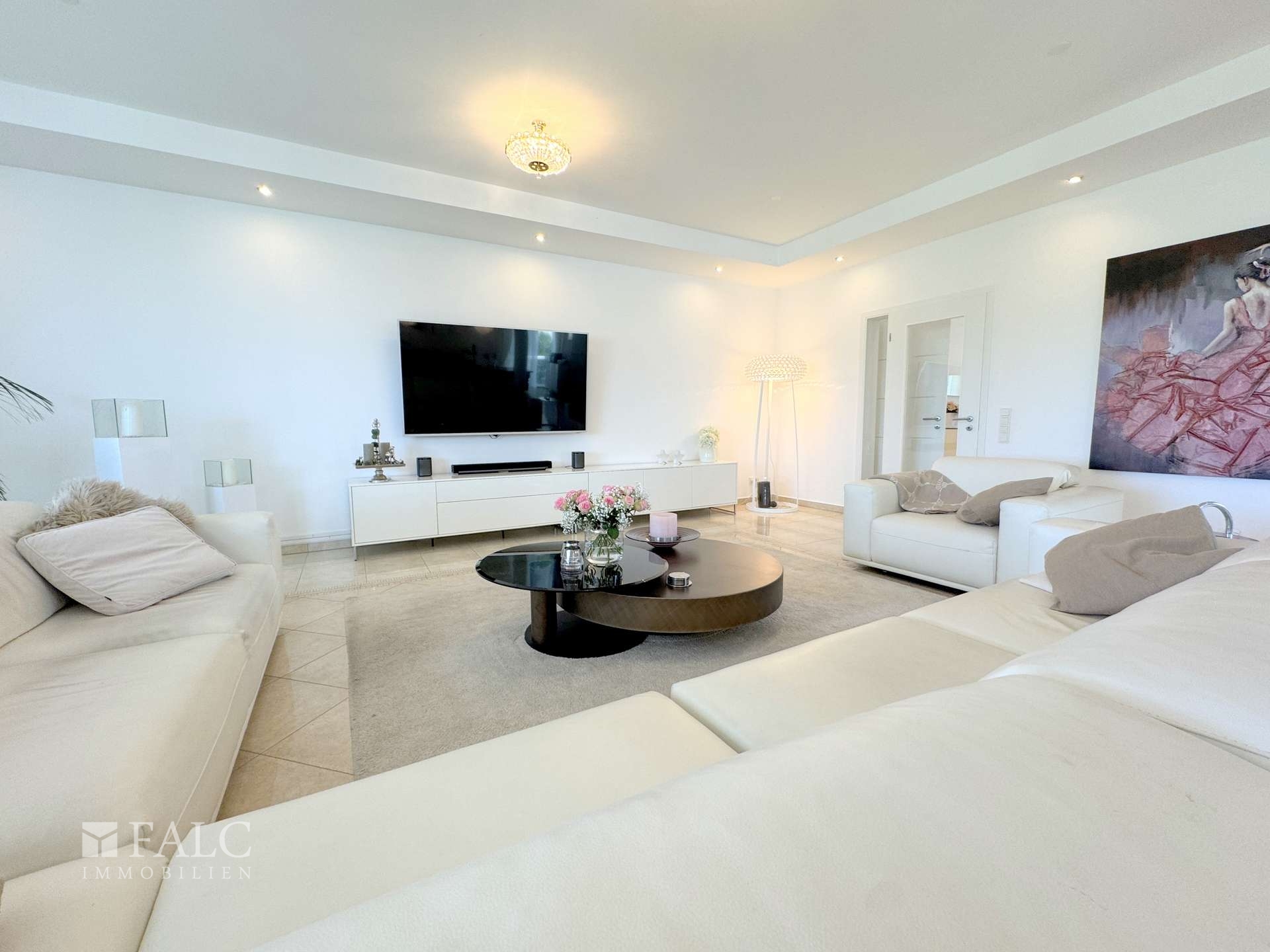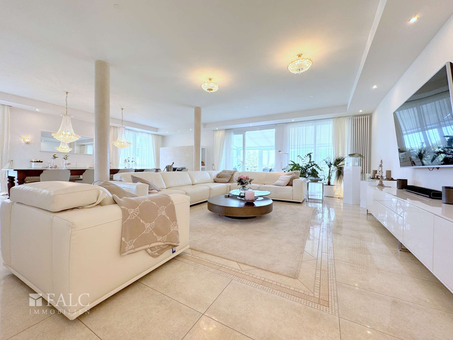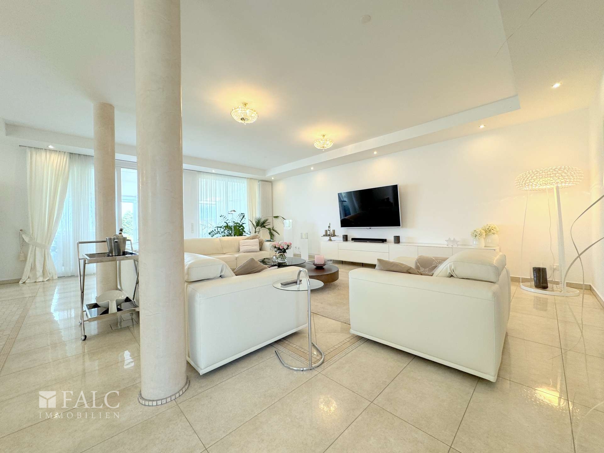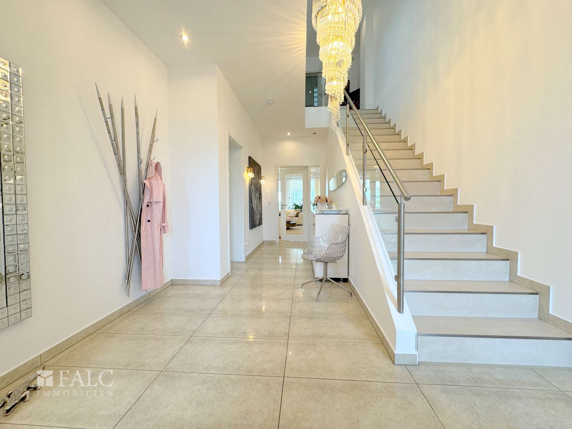 Die Hauptwohnung mit ca. 370 m² Wohnfläche erstreckt sich über Erd- und Obergeschoss und besticht durch ein durchdachtes Raumkonzept sowie exklusive Ausstattung. Hochwertige Fliesen in nahezu allen Bereichen – teilweise edelste Materialien aus Italien – verleihen der Wohnung ein elegantes, modernes Ambiente.