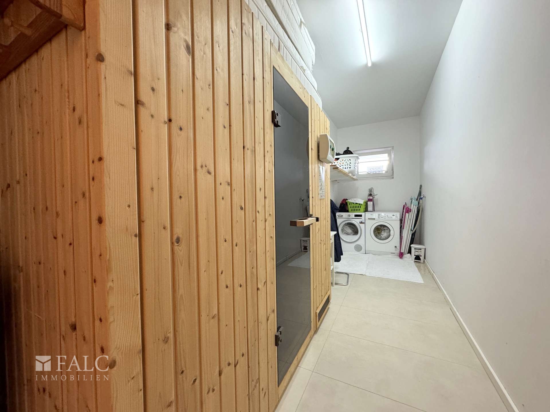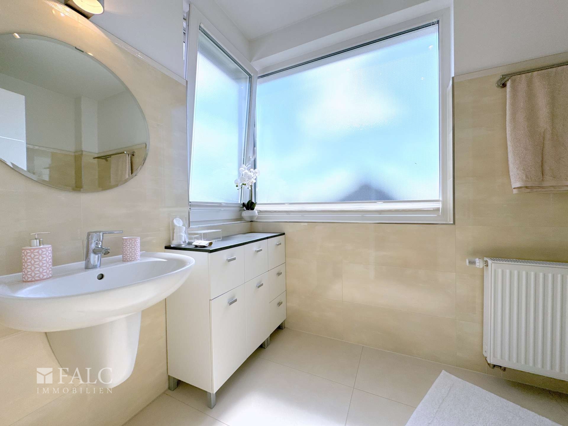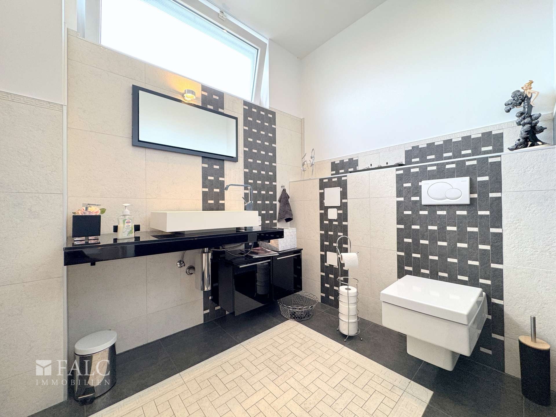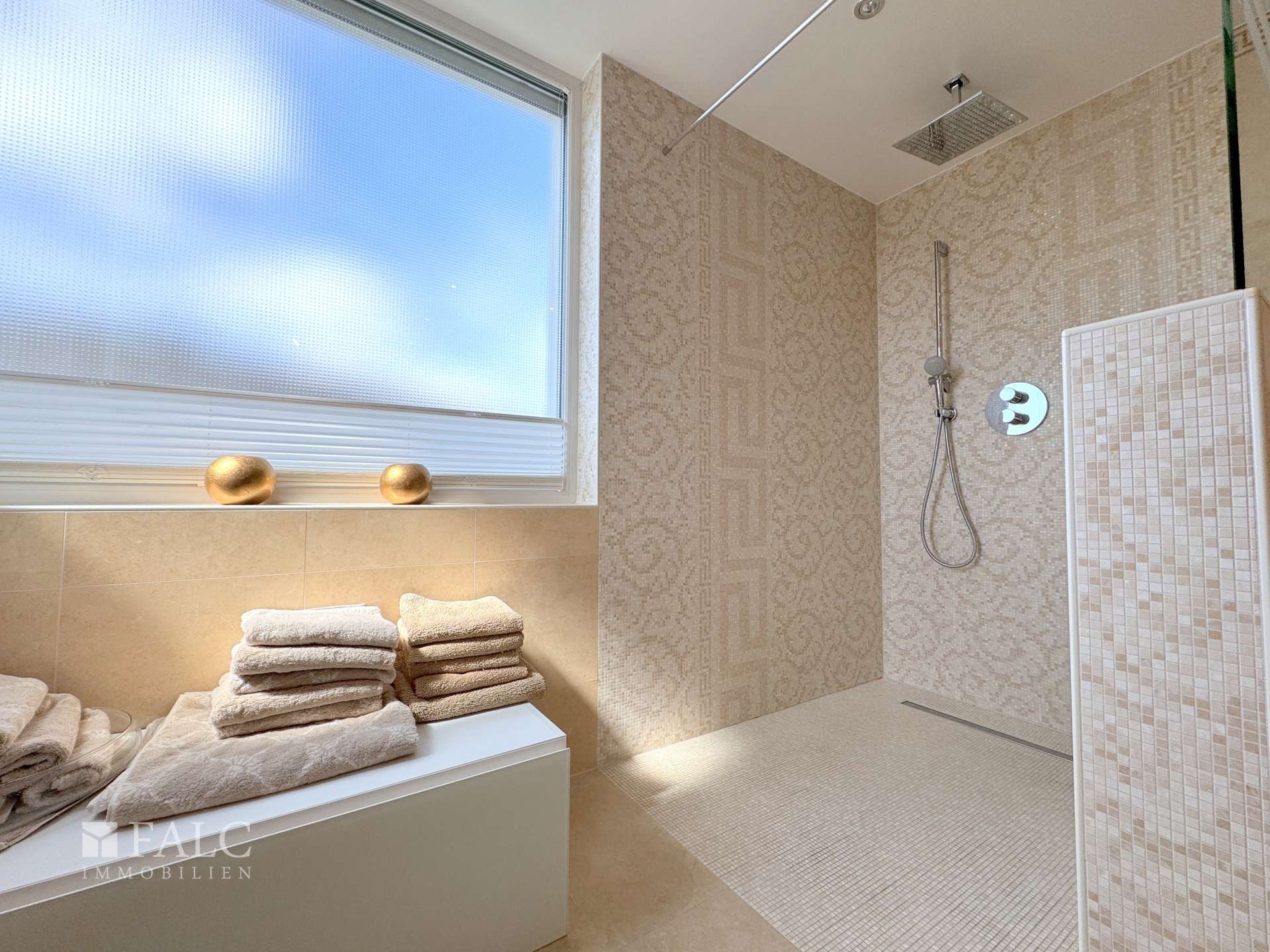 Im Obergeschoss befindet sich das großzügige Hauptschlafzimmer mit direktem Zugang zu einem stilvollen Wellness-Badezimmer sowie einem begehbaren Kleiderschrank – ein exklusiver Rückzugsort mit viel Privatsphäre. Insgesamt verfügt die Hauptwohnung über drei voll ausgestattete Badezimmer und zwei Gäste-WC´s, die den Wohnkomfort zusätzlich unterstreichen.