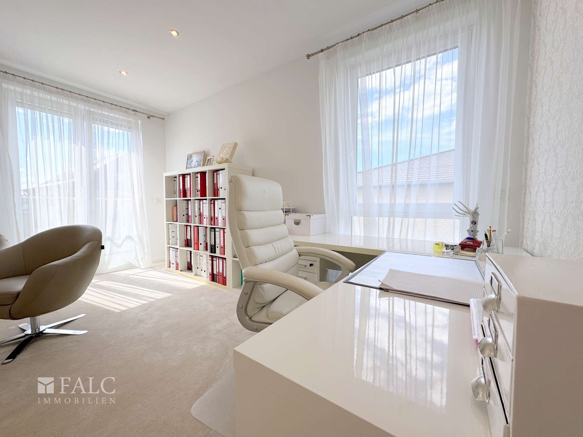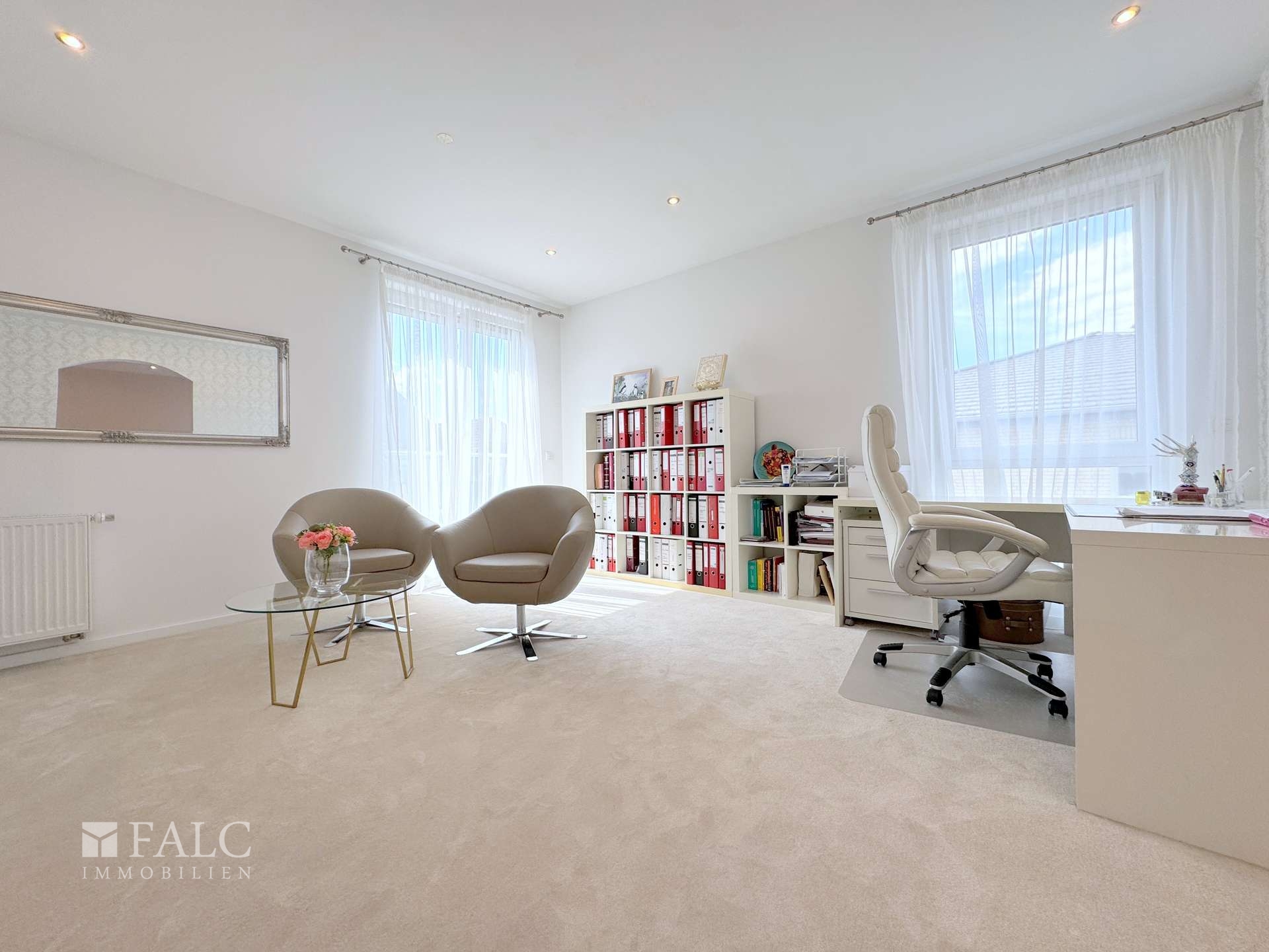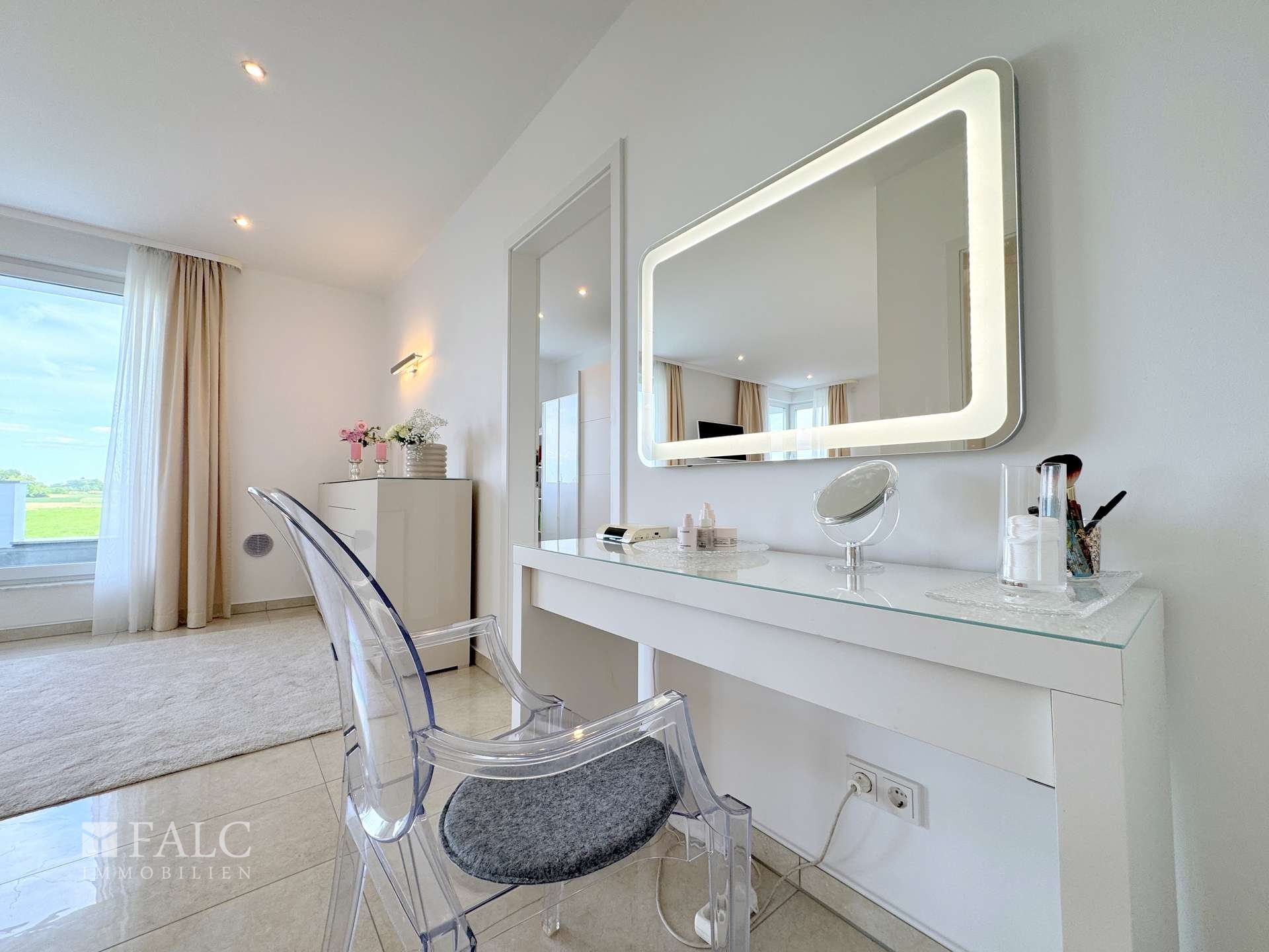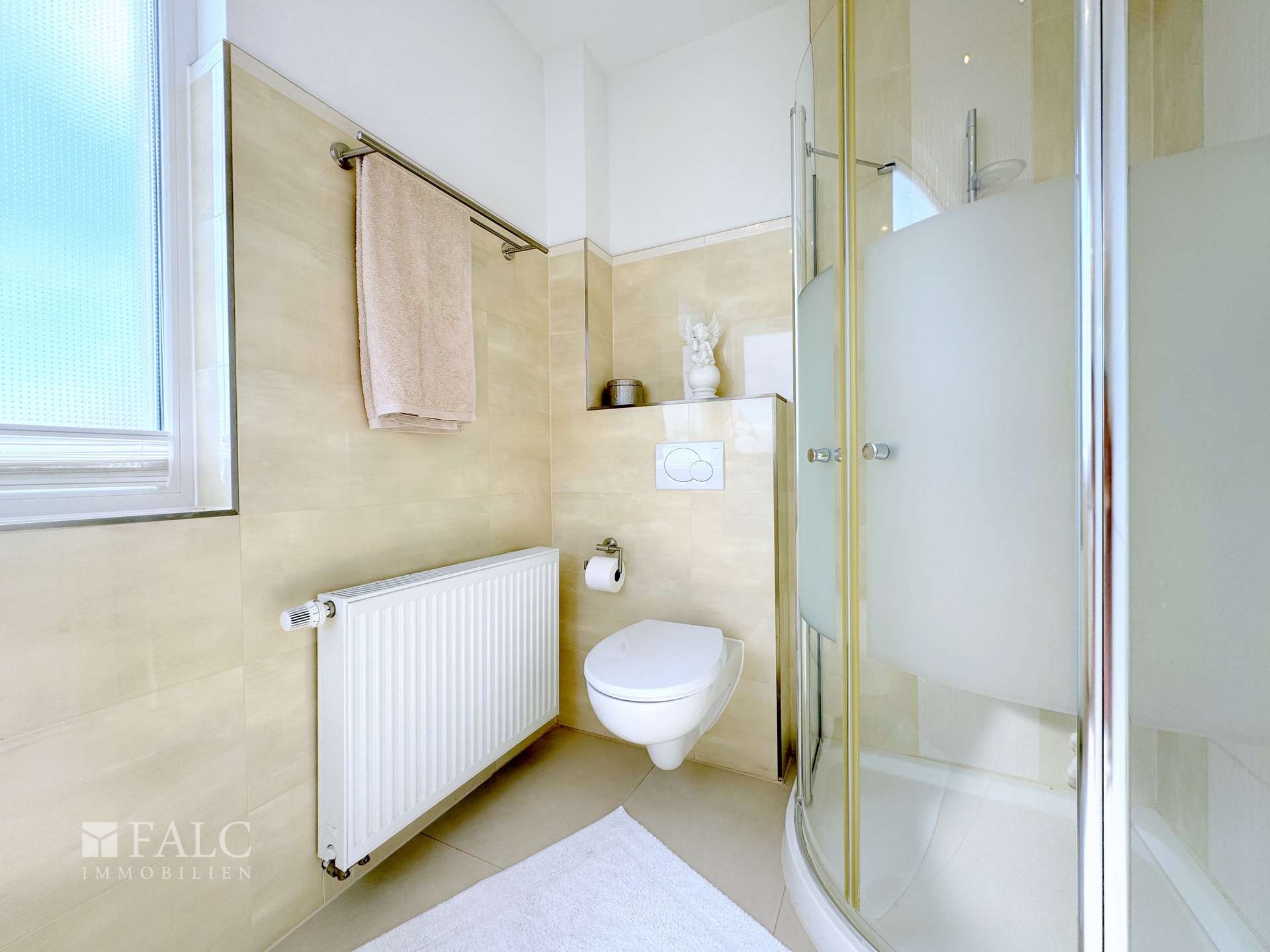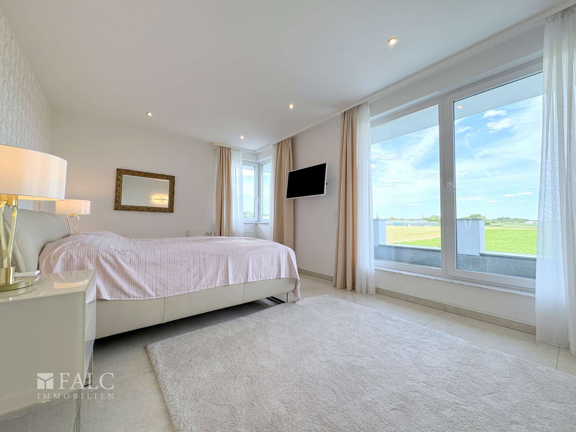 Im Obergeschoss befindet sich das großzügige Hauptschlafzimmer mit direktem Zugang zu einem stilvollen Wellness-Badezimmer sowie einem begehbaren Kleiderschrank – ein exklusiver Rückzugsort mit viel Privatsphäre. Insgesamt verfügt die Hauptwohnung über drei voll ausgestattete Badezimmer und zwei Gäste-WC´s, die den Wohnkomfort zusätzlich unterstreichen.