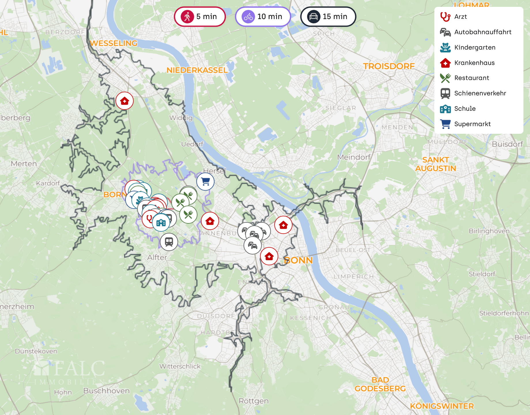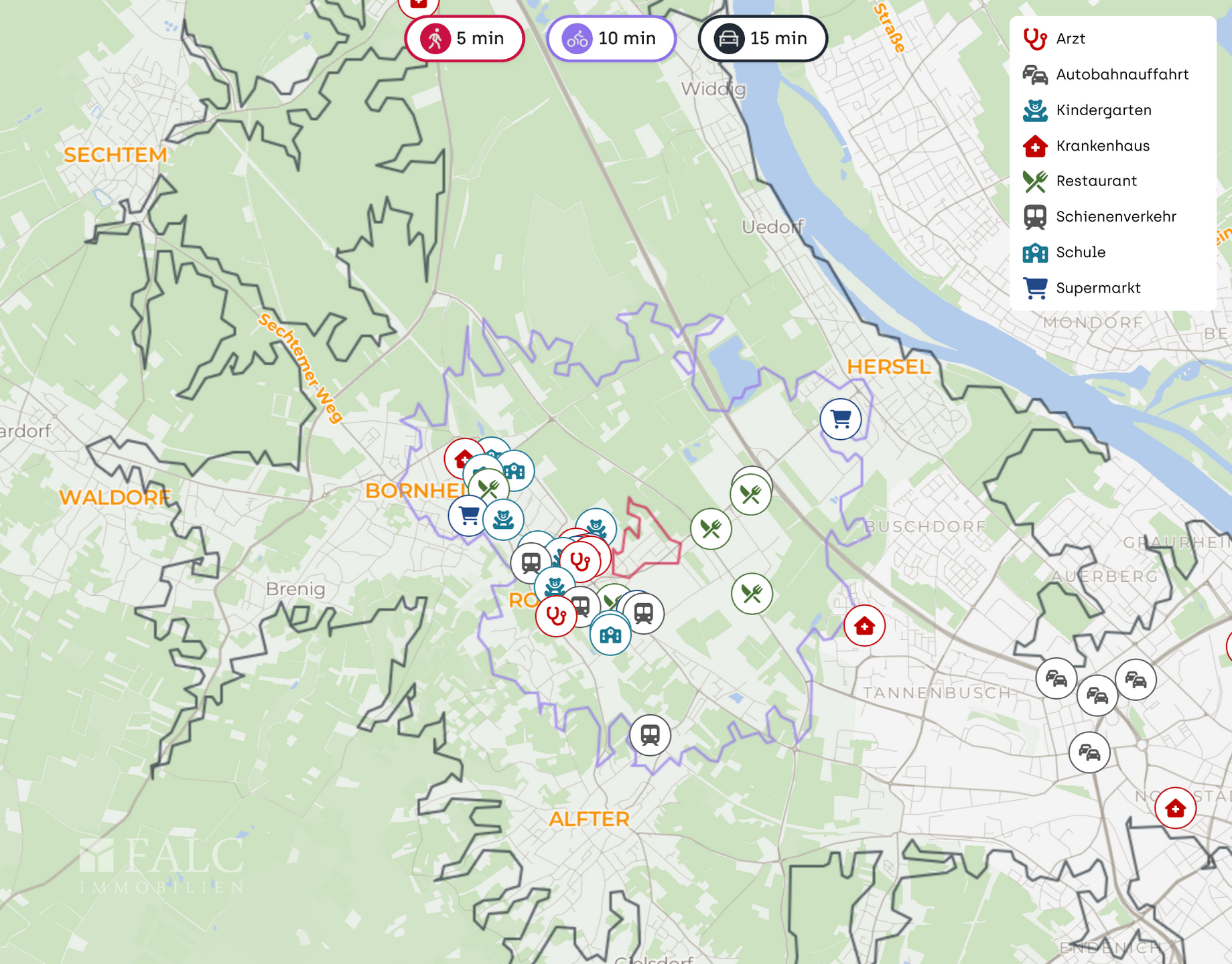 Die Anbindung an den öffentlichen Nahverkehr ist hervorragend. Die nächste Bushaltestelle ist nur einen kurzen Spaziergang entfernt, und der Bahnhof Roisdorf bietet eine schnelle Verbindung in die umliegenden Städte. Für Autofahrer ist die Autobahnauffahrt zur A 555 ebenfalls in kurzer Zeit erreichbar, was die Region besonders attraktiv für Pendler macht.