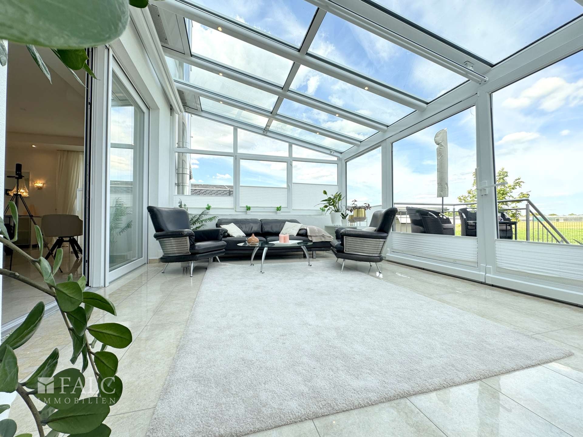 Im Erdgeschoss erwartet Sie ein großzügiger, lichtdurchfluteter Wohn- und Essbereich mit Kaminofen, eine moderne Einbauküche sowie ein eleganter Wintergarten mit Klimaanlage und Beschattung, der ganzjährig als erweiterter Wohnraum dient. Von hier gelangen Sie in den traumhaften Wintergarten mit traumhafter Fernsicht. Ein Gäste-WC ergänzt den Wohnkomfort auf dieser Ebene.