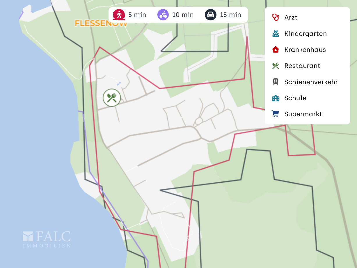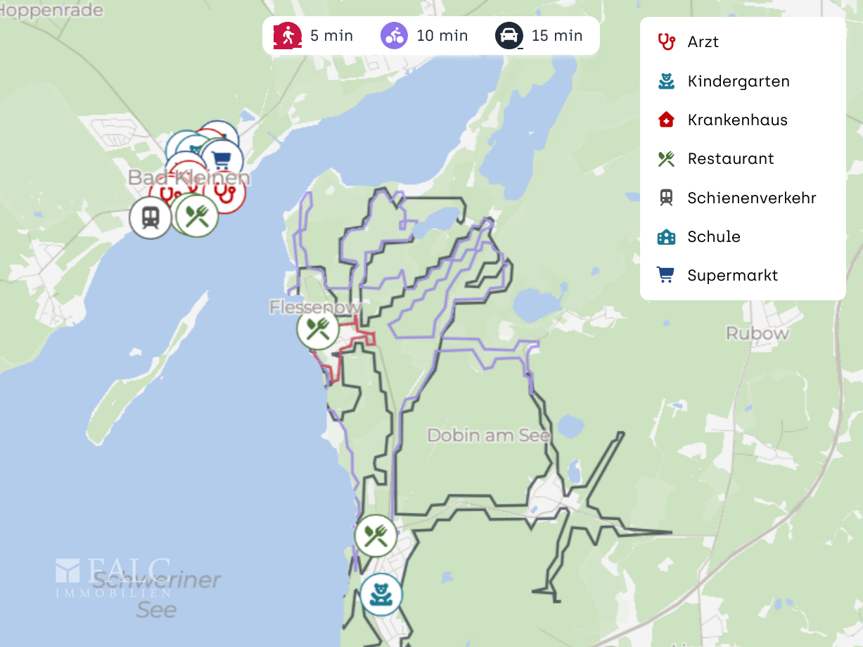 Kindergarten „Uns‘ Flinkfläuter“ und die Regionale Schule mit Grundstufe „Am Schweriner See“ befinden sich in nur etwa 2-3 km Entfernung – bequem in wenigen Fahrminuten erreichbar . Die nächste Bushaltestelle „Flessenow“ liegt nur rund 120 m vom Haus entfernt. Der nächstgelegene Bahnhof in Bad Kleinen ist etwa 2,5 km entfernt und eröffnet direkte Zuganbindungen in die Region.