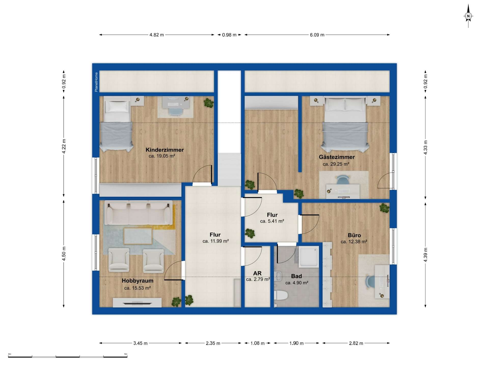 Schon das Erdgeschoss überzeugt mit einem weitläufigen Flur, der in alle Wohnräume führt. Die Küche mit hochwertiger Einbauküche öffnet sich zum lichtdurchfluteten Wintergarten mit gemütlicher Sitzecke – ein Ort zum Entspannen, Träumen und Genießen. Das großzügige Wohnzimmer mit Panoramafenster und Kaminofen ist das Herzstück des Hauses – hier fühlt man sich sofort zu Hause. Zwei stilvolle Badezimmer, eines mit ebenerdiger Dusche, Badewanne und Tageslicht, sowie zwei individuell nutzbare Zimmer runden das Erdgeschoss perfekt ab.