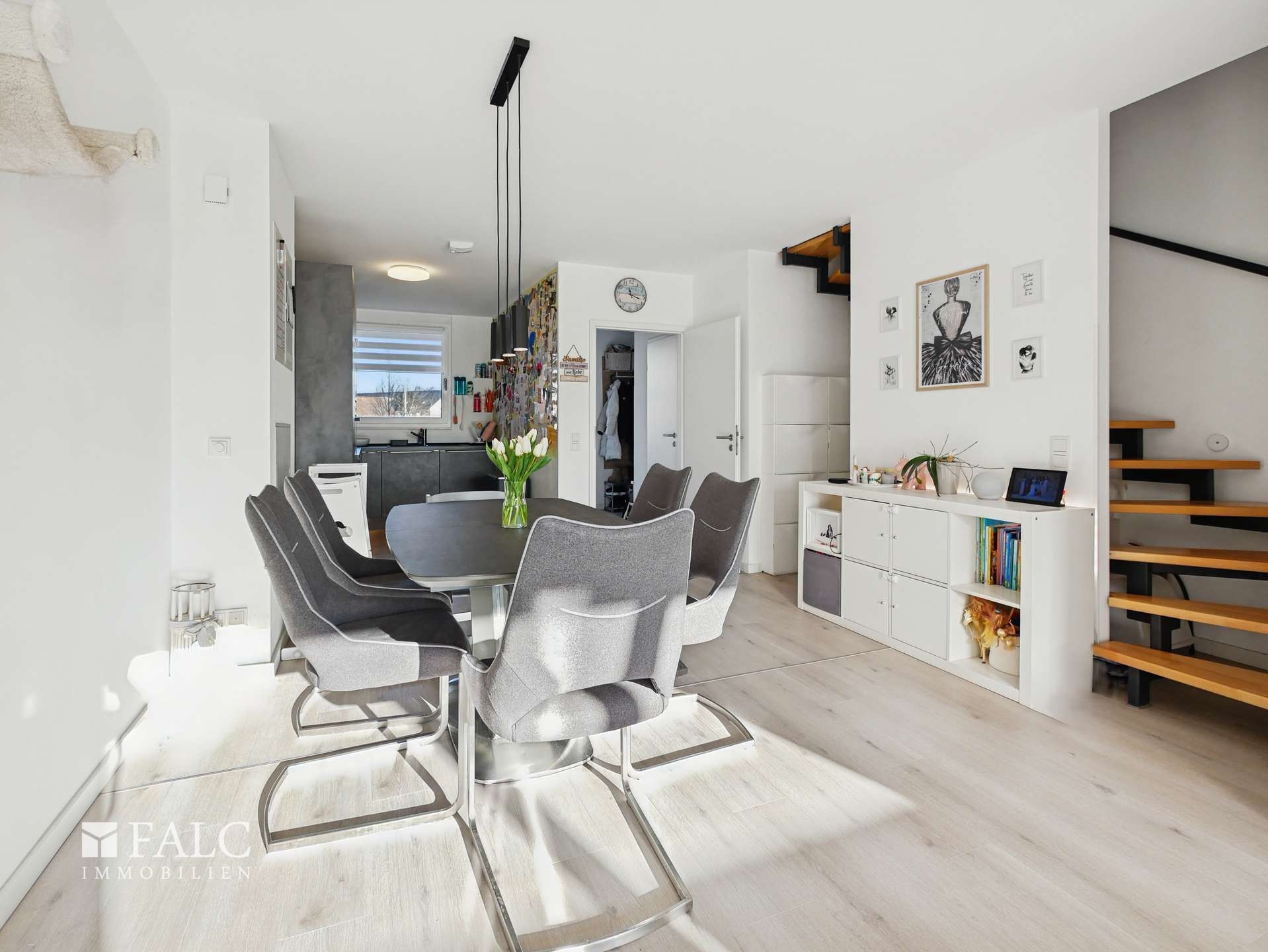 Von der Diele öffnet sich das Erdgeschoss in den Wohn- und Essbereich. Hier ist der Mittelpunkt des Hauses: ein großzügiger Raum mit viel Tageslicht und breiten Fensterflächen. Der Essplatz liegt angenehm nah an der Küche, sodass Wege kurz bleiben. Die Küche ist modern gehalten, mit viel Arbeitsfläche und Stauraum, ideal für das tägliche Familienleben. Vom Wohnbereich geht es direkt auf die Terrasse (Süd-Ausrichtung). Draußen wartet ein geschützter Sitzplatz mit Platz für Tisch und Lounge, dazu ein Gartenbereich, der sich als Spiel und Ruhezone nutzen lässt.