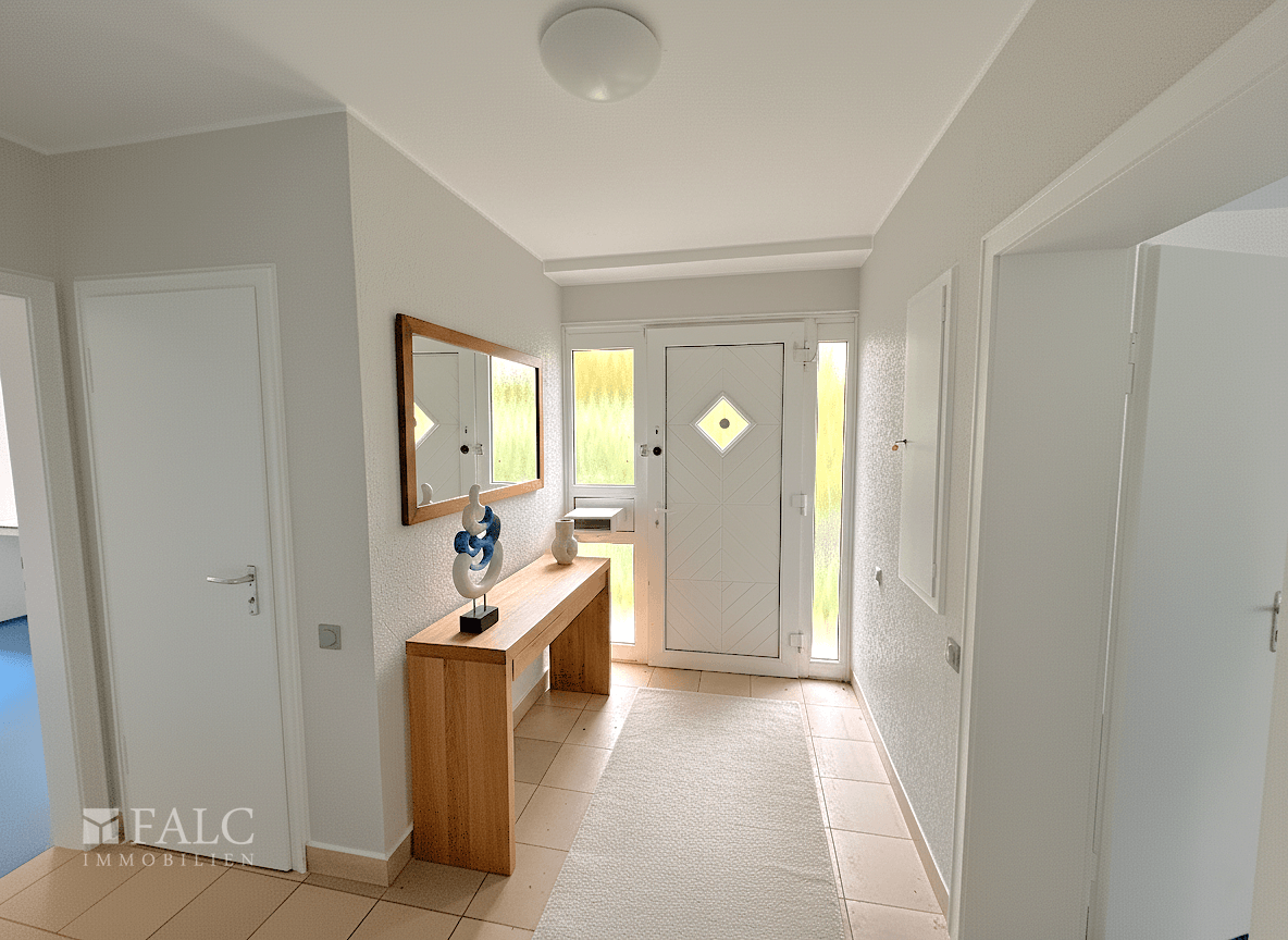 Vom Flur aus führt eine Treppe in das Obergeschoss, wo sich die privaten Räume des Hauses befinden. Hier erwarten Sie mehrere Schlafzimmer, die flexibel genutzt werden können, sei es als Kinderzimmer, Büro oder Gästezimmer. Das Hauptschlafzimmer bietet einen ruhigen Rückzugsort mit Blick ins Grüne.