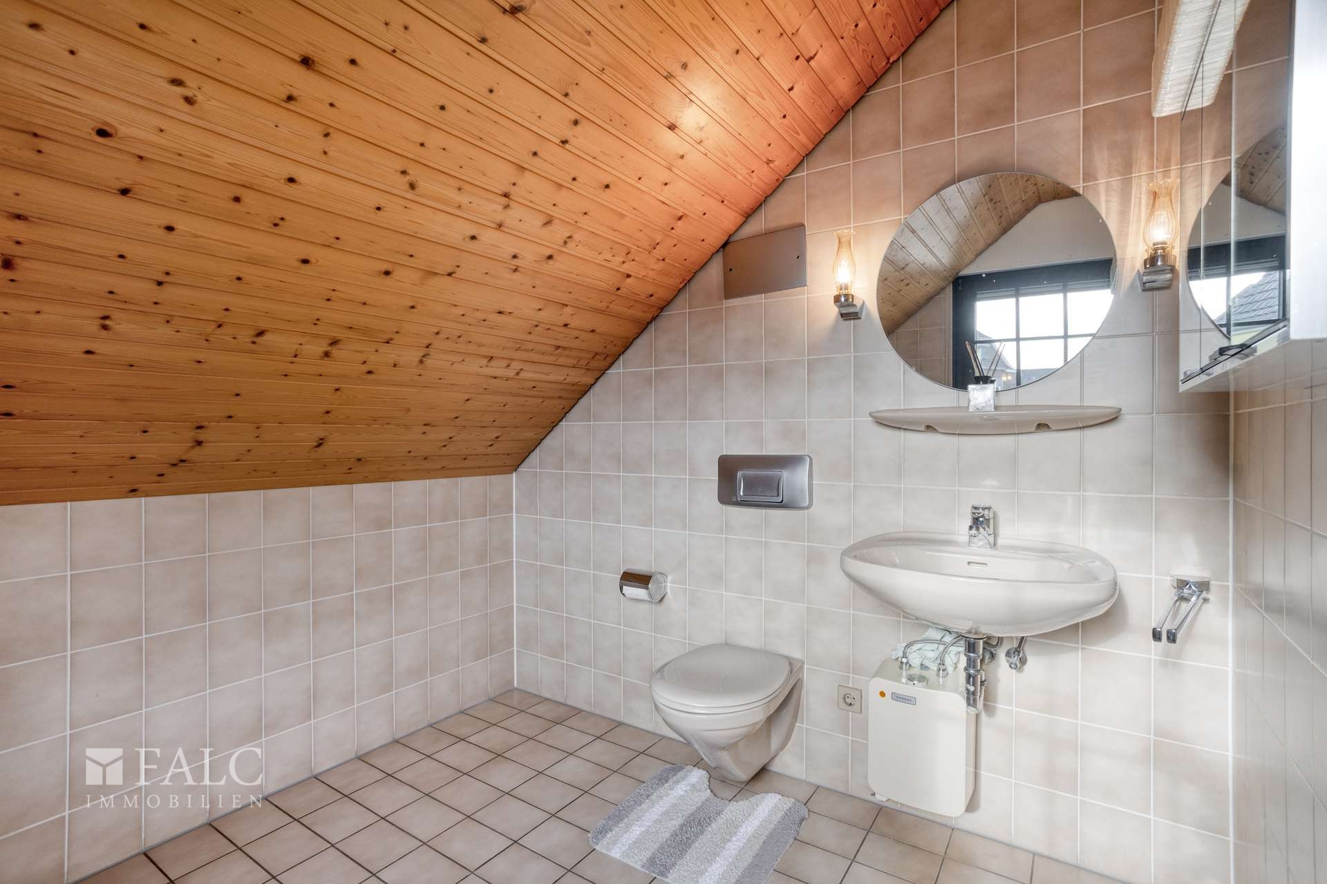 Im Obergeschoss setzt sich das harmonische Wohnkonzept fort. Hier finden Kinder, Gäste oder Homeoffice-Arbeiter ihren Rückzugsort. Ein helles Kinderzimmer, ein Büro mit Abstellraum und Blick ins Grüne, ein separates WC sowie ein Ankleidezimmer bieten vielfältige Nutzungsmöglichkeiten und machen das Wohnen flexibel und modern.