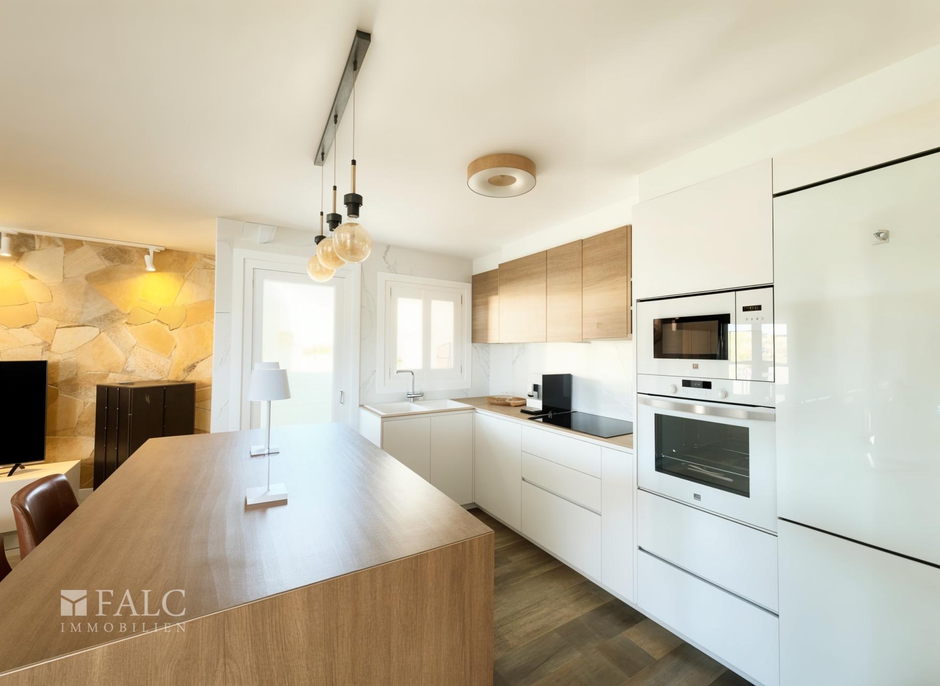 Die moderne, offen gestaltete Küche fügt sich perfekt in den Wohnbereich ein. Hochwertige Elektrogeräte, die Kombination aus eleganten Holz- und weißen Fronten sowie ein zentraler Küchenblock machen sie zum idealen Ort für kulinarische Momente und geselliges Kochen.