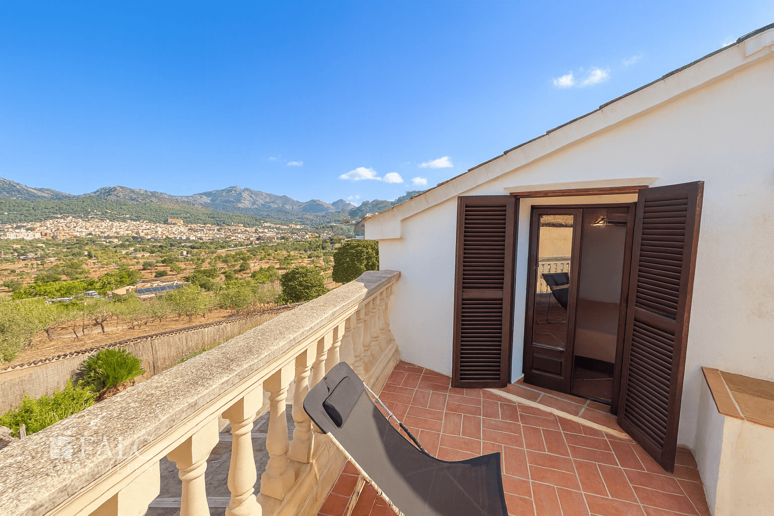 Im Obergeschoss liegen zwei Doppel-Schlafzimmer. Das Hauptschlafzimmer verfügt über ein stilvolles en suite-Bad mit Walk-in-Dusche, während das zweite Schlafzimmer direkten Zugang zu einer privaten Terrasse mit Sauna und Panoramablick über Andratx und die umliegende Landschaft bietet.