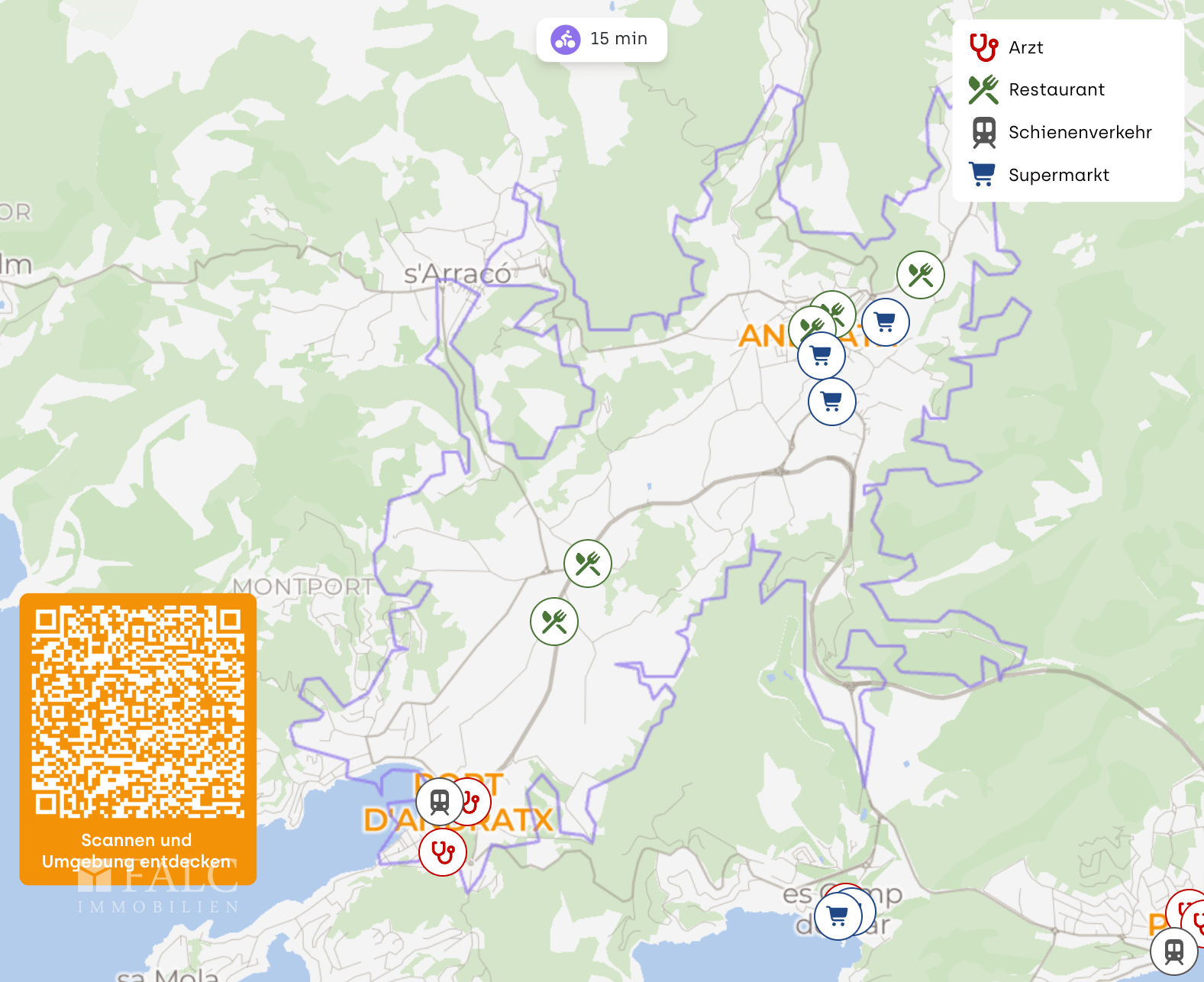 Die Anbindung an den öffentlichen Nahverkehr ist durch die nahegelegene Bushaltestelle Torrent in Andratx, die sich ca. 820 Meter entfernt befindet, gewährleistet. Dies erleichtert Ihnen die Mobilität innerhalb der Region und bietet eine praktische Alternative zum Auto.
