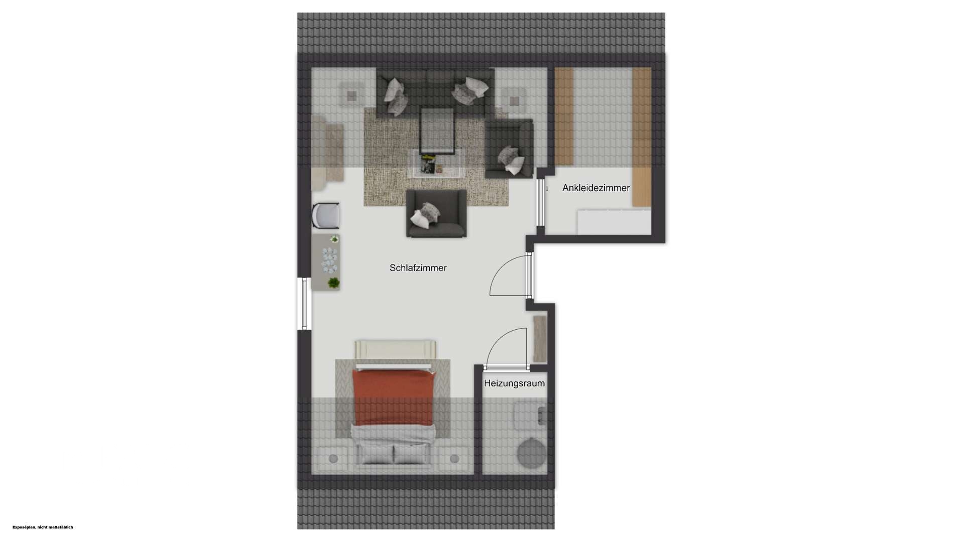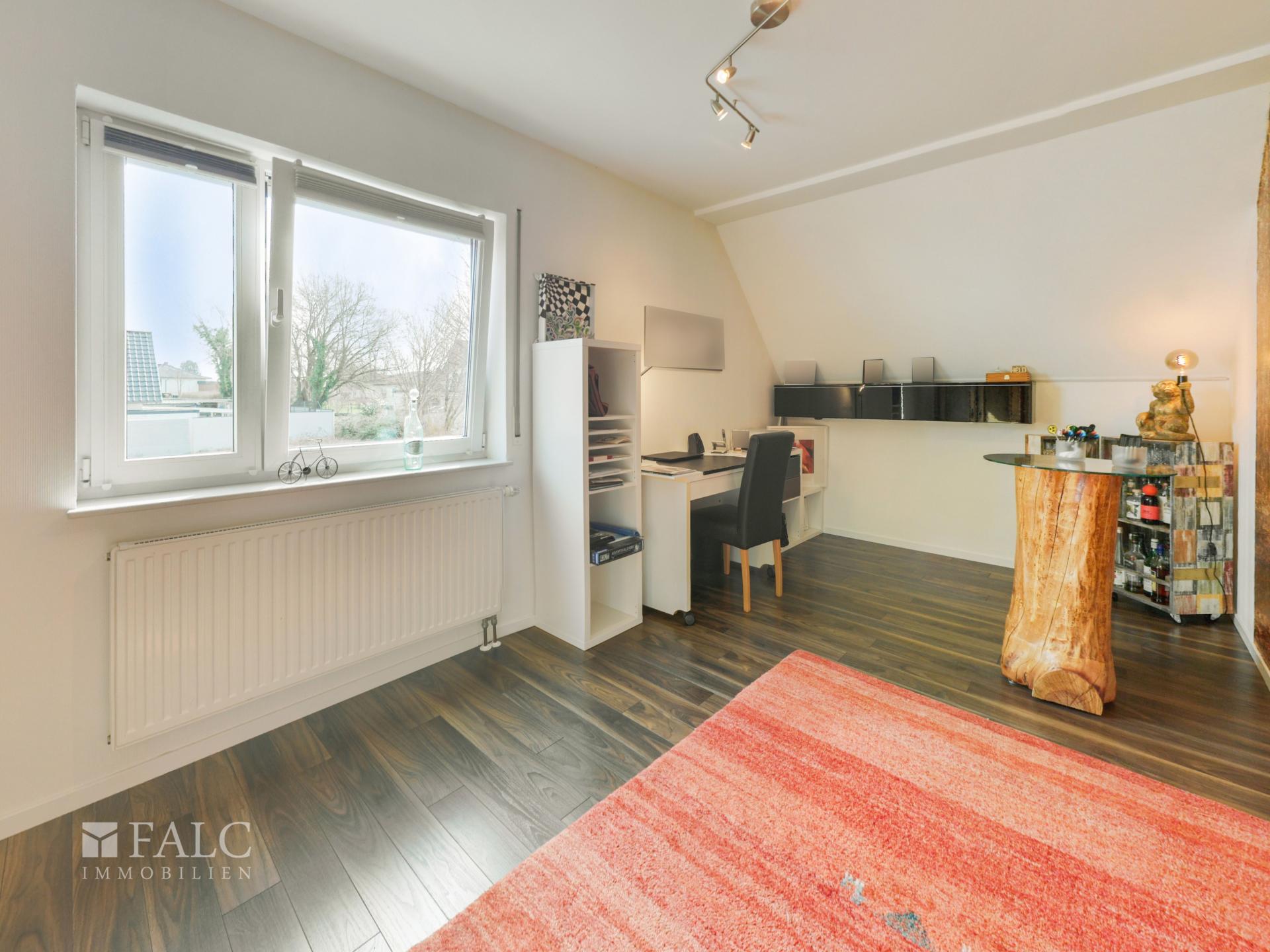Im Dachgeschoss befindet sich ein weiteres großzügiges Zimmer, das sich ideal als Elternbereich, Gästezimmer oder Arbeitszimmer eignet. Ein kleiner Ankleideraum ergänzt diesen Bereich und schafft zusätzlichen Stauraum.
