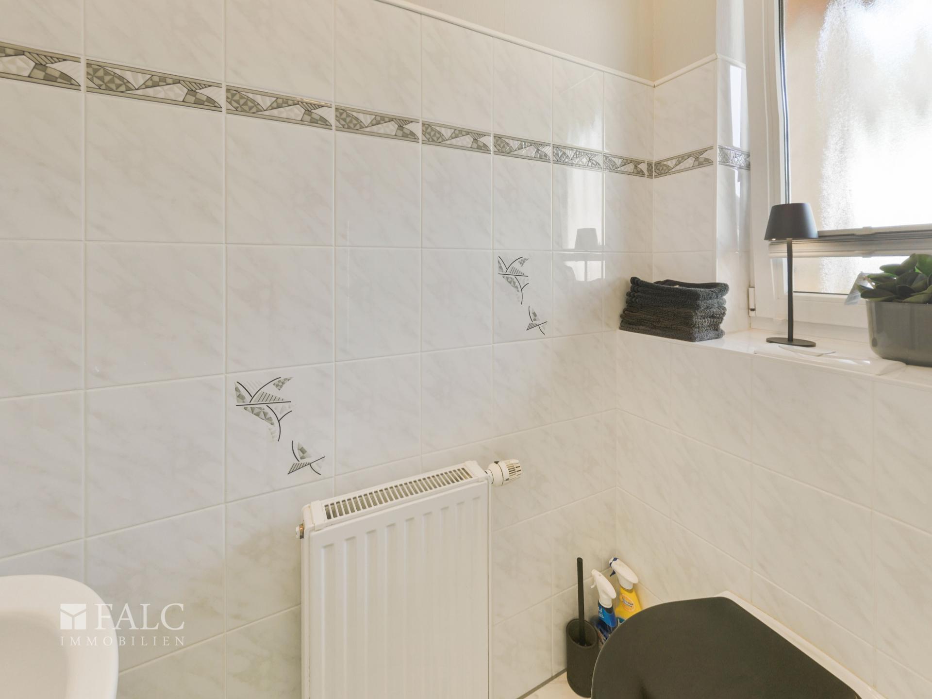 Das Badezimmer ist mit einer Dusche und einer Badewanne ausgestattet und verfügt über ein Fenster, das für Tageslicht und eine gute Belüftung sorgt. Ein Doppelwaschtisch bietet zusätzlichen Komfort. Ergänzt wird das Raumangebot durch ein Gäste-WC im Erdgeschoss.