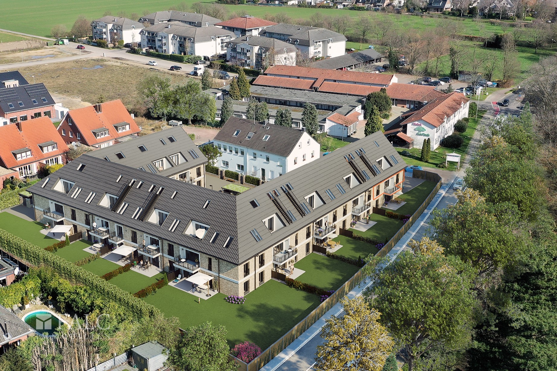 Zur Parkstraße wird ein praktischer Lärmschutzwall gebaut (siehe Visualisierungen), um Lärmbelästigungen zu vermeiden.