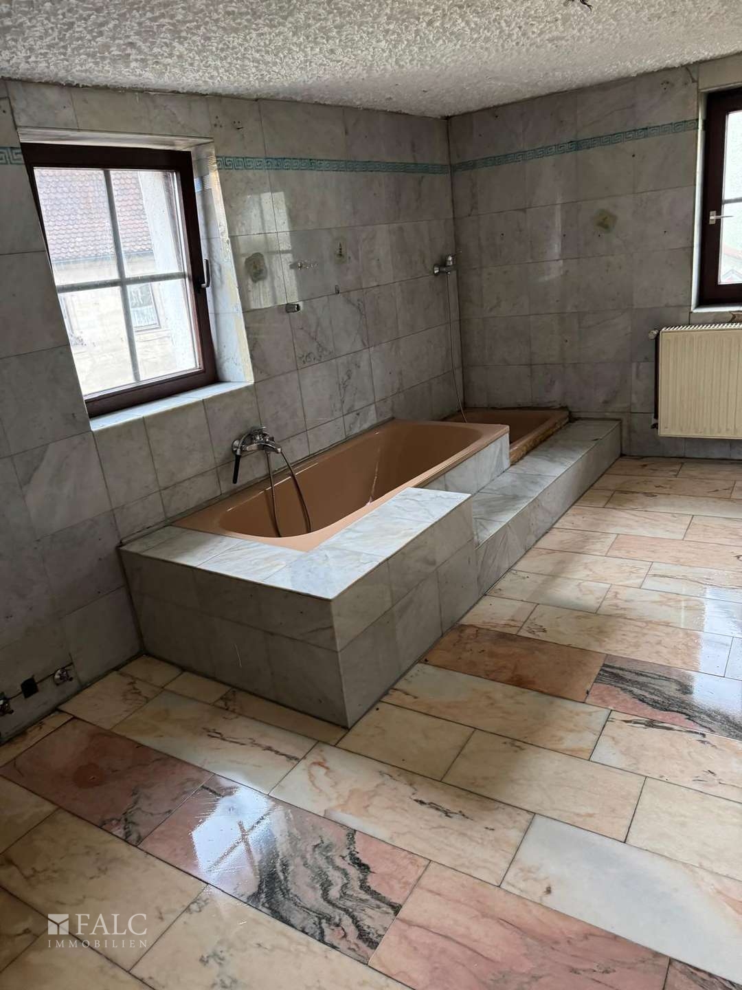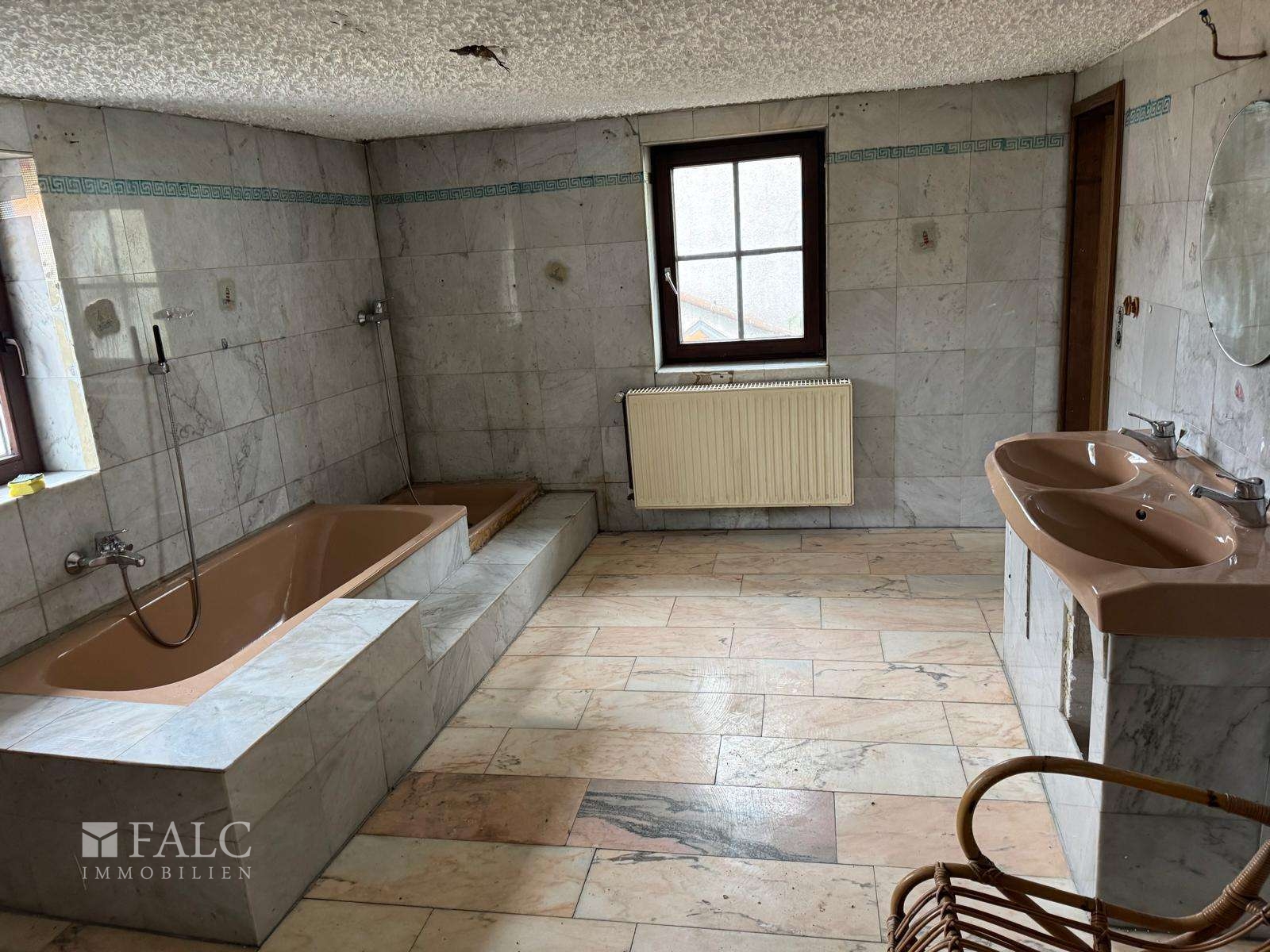 Großes, helles Badezimmer mit Badewanne, Dusche, Fenster
