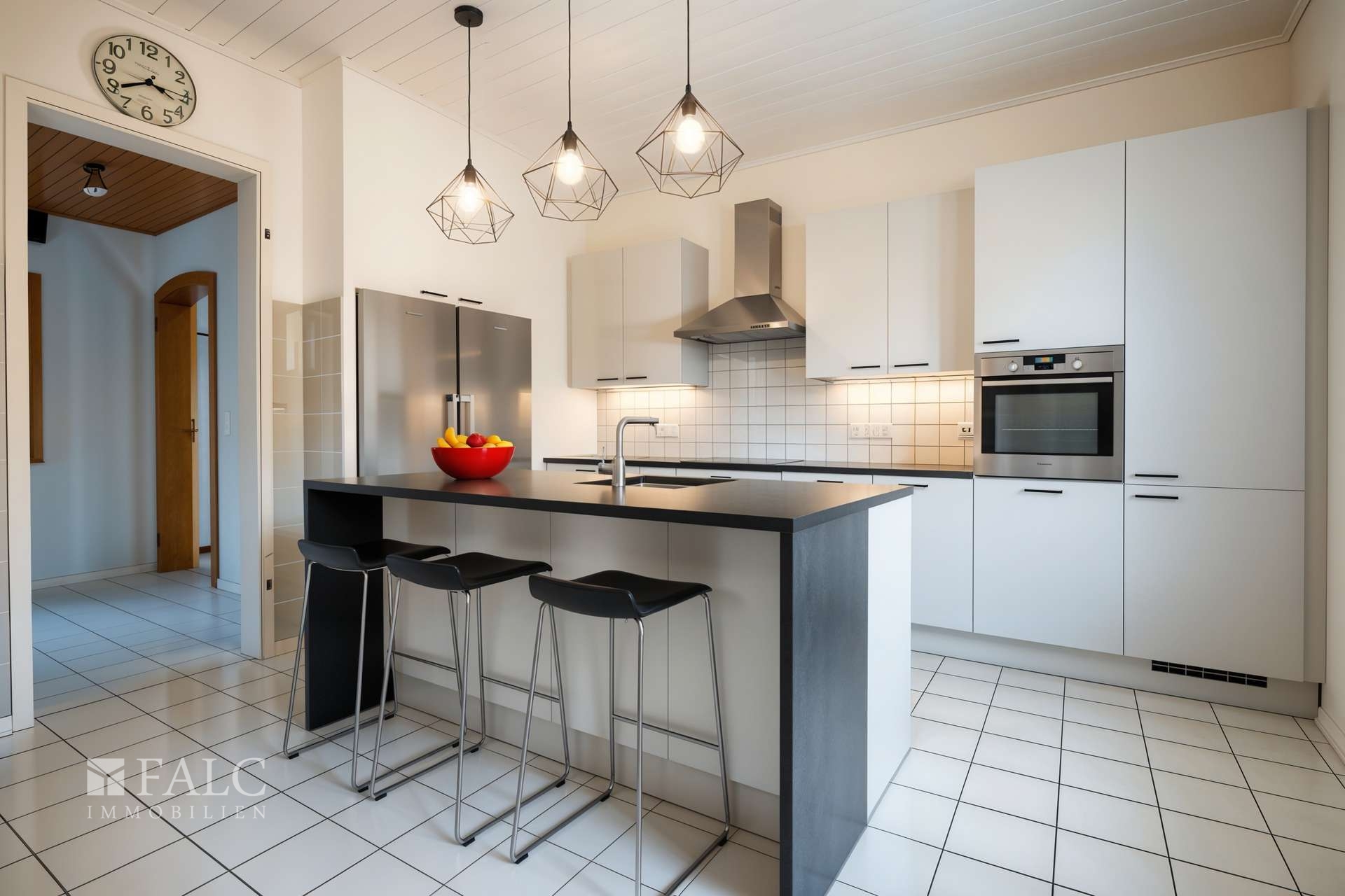 Das Badezimmer, die Küche und das Esszimmer sind modern weiß gefliest.