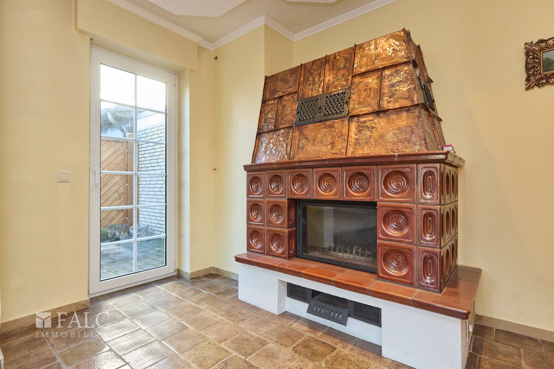 Ein Kaminofen wurde wohnlich innerhalb eines halboffenen Kaminzimmers abgetrennt; eine schöne Gelegenheit für eine Lese-Ecke oder für einen Essbereich neben der Küche? - Sie entscheiden.