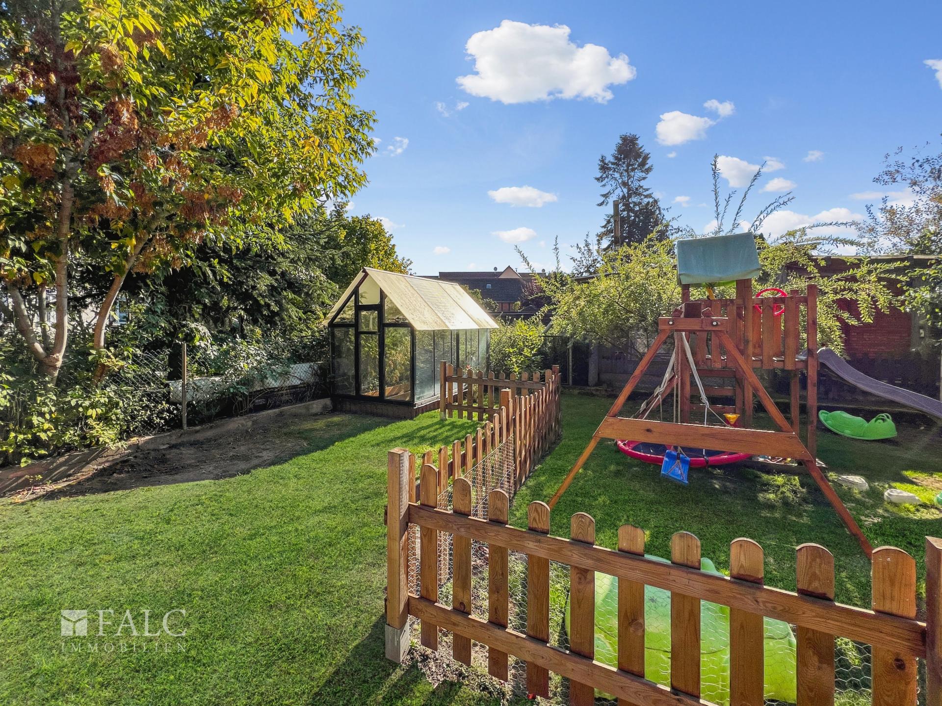 Darüber hinaus bietet der Garten ausreichend Platz für einen Kinderspielplatz, Hochbeete und ein Gewächshaus.
