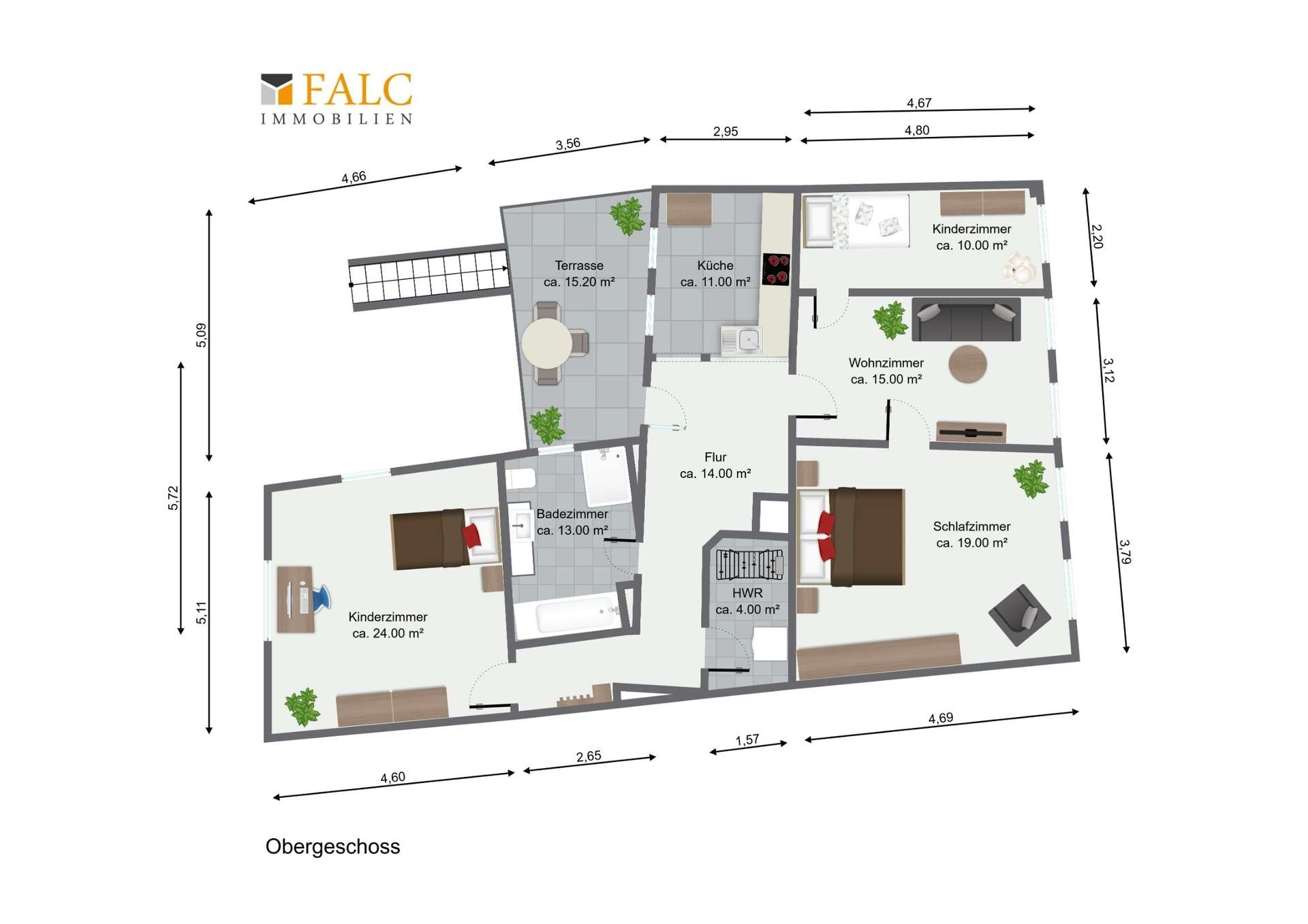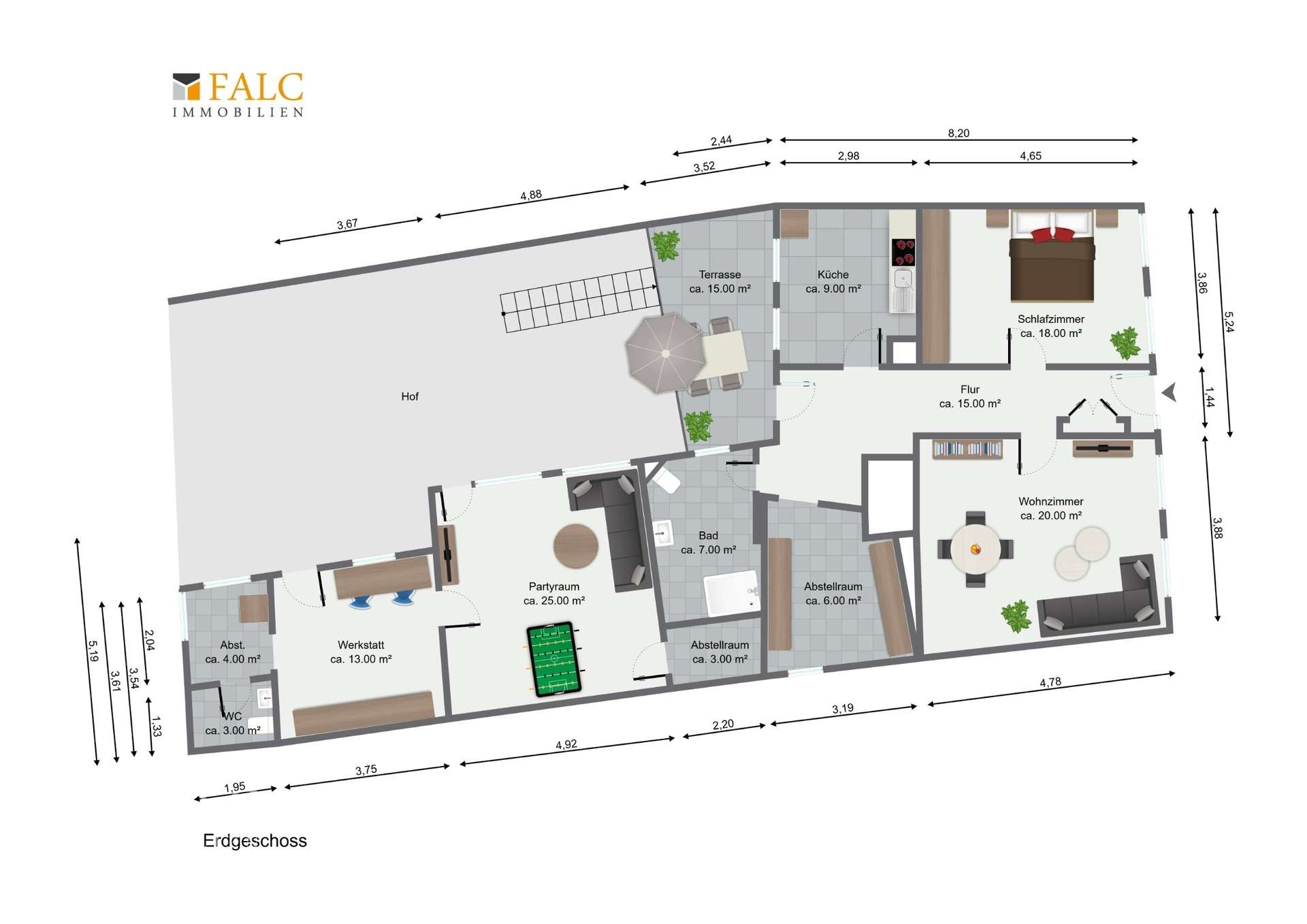 Zur Info, aufgrund der 3D-Perspektive wirken die Räumlichkeiten in der Regel etwas kleiner als in der Realität vor Ort.