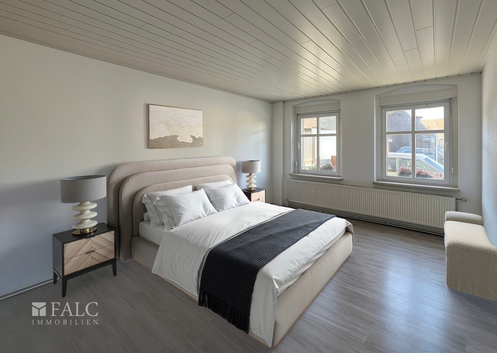Die Möbel im Wohnzimmer und Schlafzimmer im Erdgeschoss sind digital gestaltet worden. Die Beschaffenheit der Räume ist komplett original belassen.