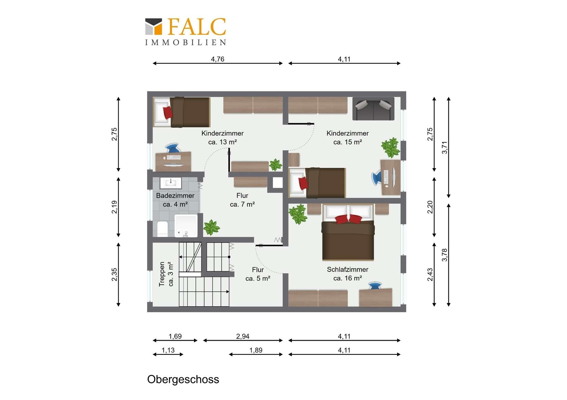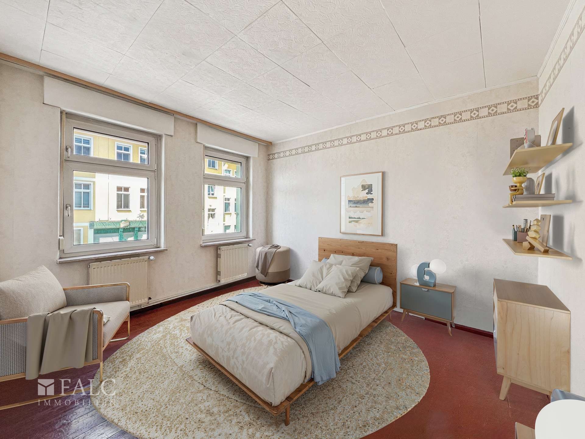 Die Möbel im Wohnzimmer, Schlafzimmer und Kinderzimmer sind digital gestaltet worden. Die Beschaffenheit der Räume ist komplett original belassen.