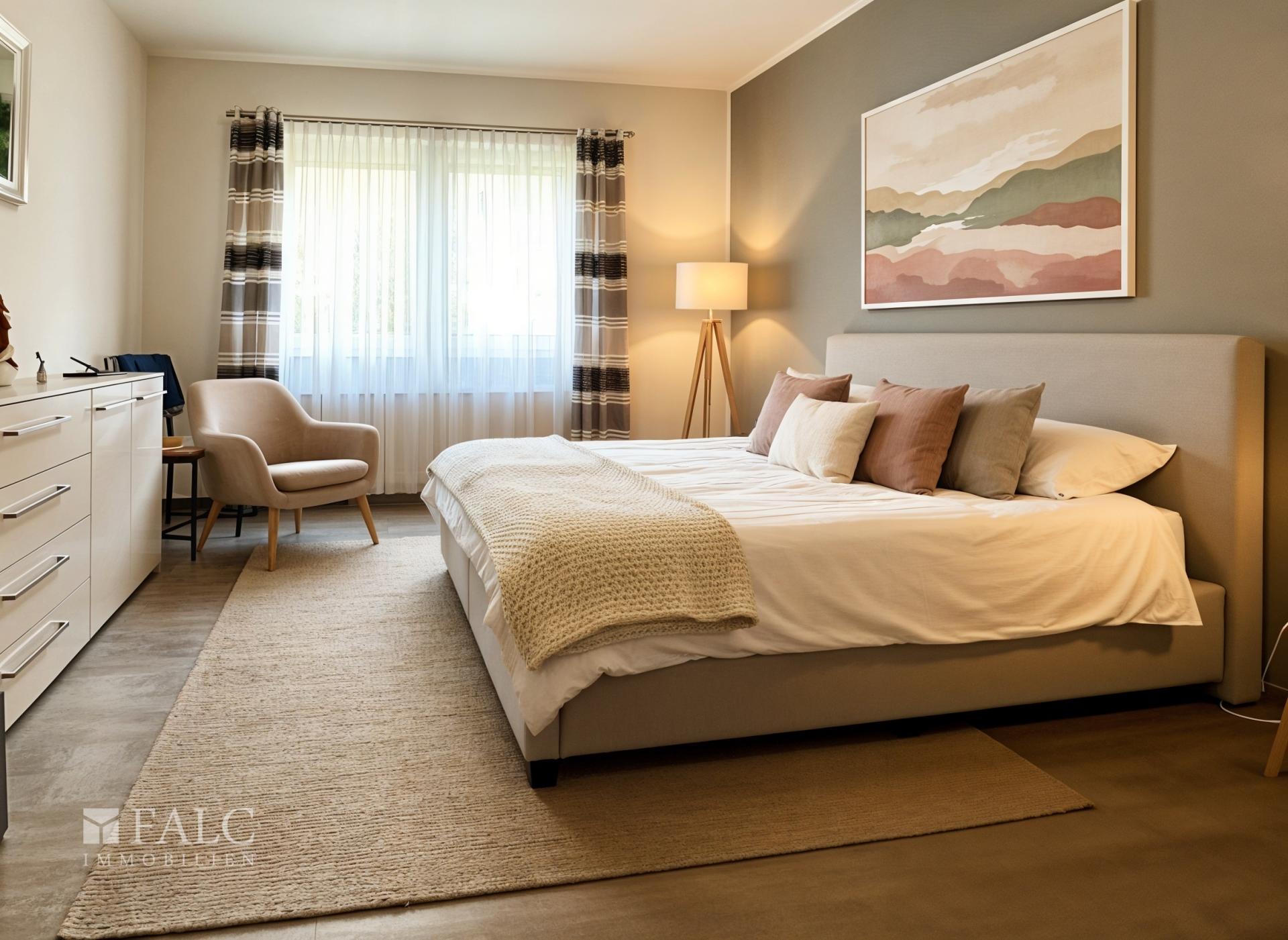 Das Schlafzimmer ist ein ruhiger Rückzugsort, der genügend Platz für ein großes Bett und einen Kleiderschrank bietet. Auch hier sorgen große Fenster für viel Licht und eine angenehme Atmosphäre.