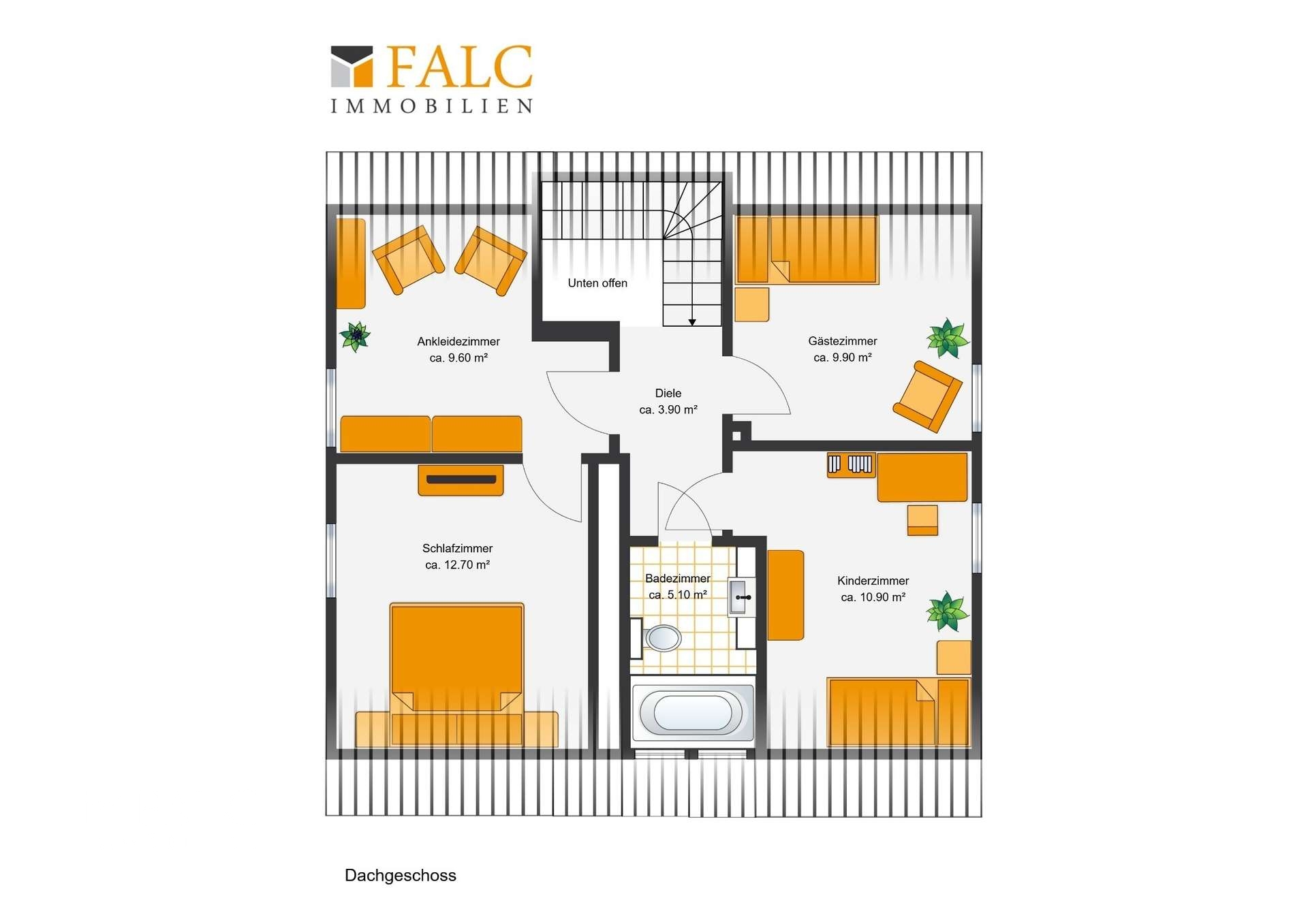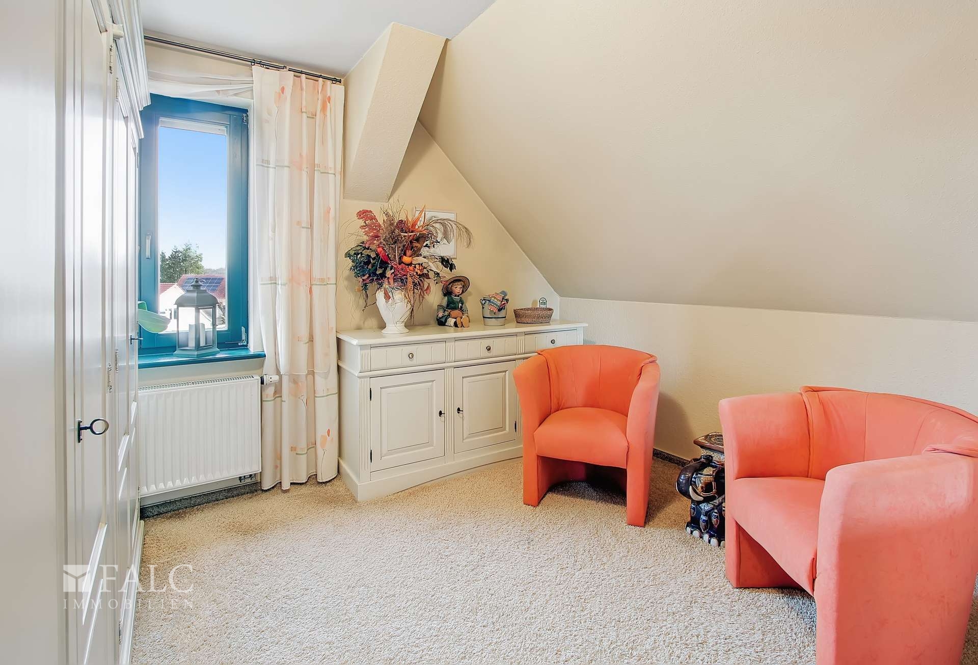Im Obergeschoss befinden sich zwei Kinder-/Gästezimmer sowie ein großes Schlafzimmer mit Ankleide. Das Badezimmer ist hell und modern gestaltet, die Badewanne unter der Dachschräge lässt Sie den Stress des Alltags vergessen.