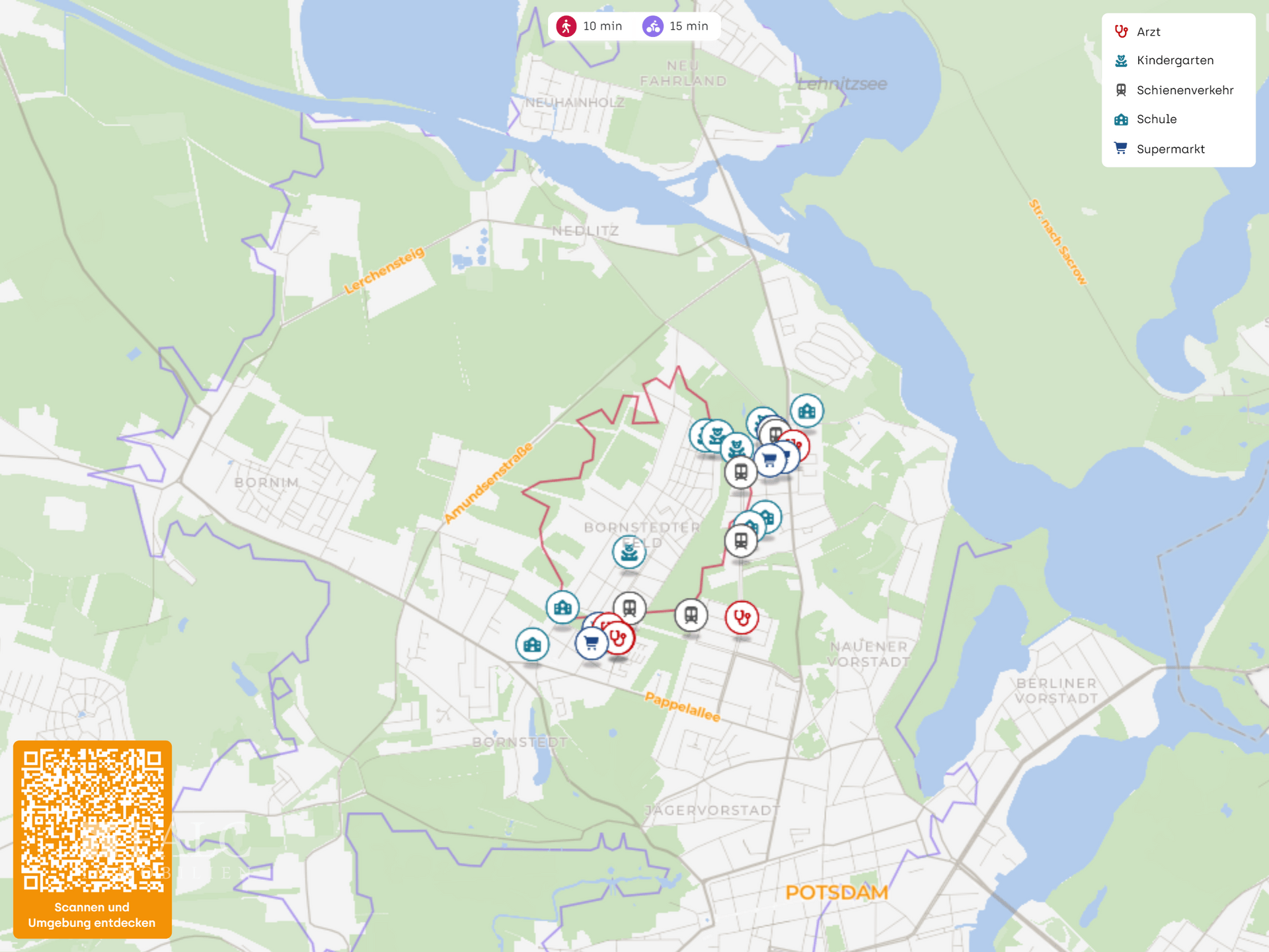 In direkter Nachbarschaft eröffnen sich großzügige Felder und Grünflächen, die einen weiten Blick ins Freie ermöglichen und zu Spaziergängen, Joggingrunden oder Fahrradtouren einladen. Nur wenige Minuten entfernt liegt der beliebte Volkspark Potsdam - ein weitläufiges Freizeit- und Erholungsareal mit Spielplätzen, Veranstaltungsflächen, Sportangeboten und weitläufigen Grünanlagen.