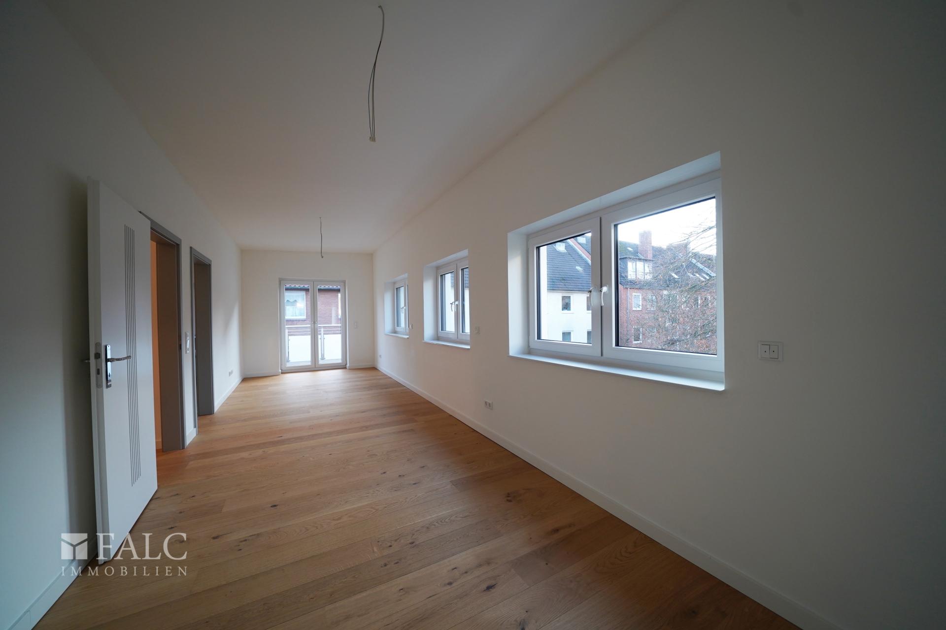 Über das Treppenhaus erreichen Sie das zweite Obergeschoss, in dem sich eine gut geschnittene Drei-Zimmer-Wohnung mit einer Wohnfläche von ca. 77 m² befindet. Der zentrale Mittelpunkt der Wohnung ist der offen gestaltete Wohn- und Essbereich mit ca. 24 m², der durch seine klare Raumstruktur vielfältige Einrichtungsmöglichkeiten bietet. Große Fensterflächen sorgen für viel Tageslicht und eine angenehme Wohnatmosphäre.