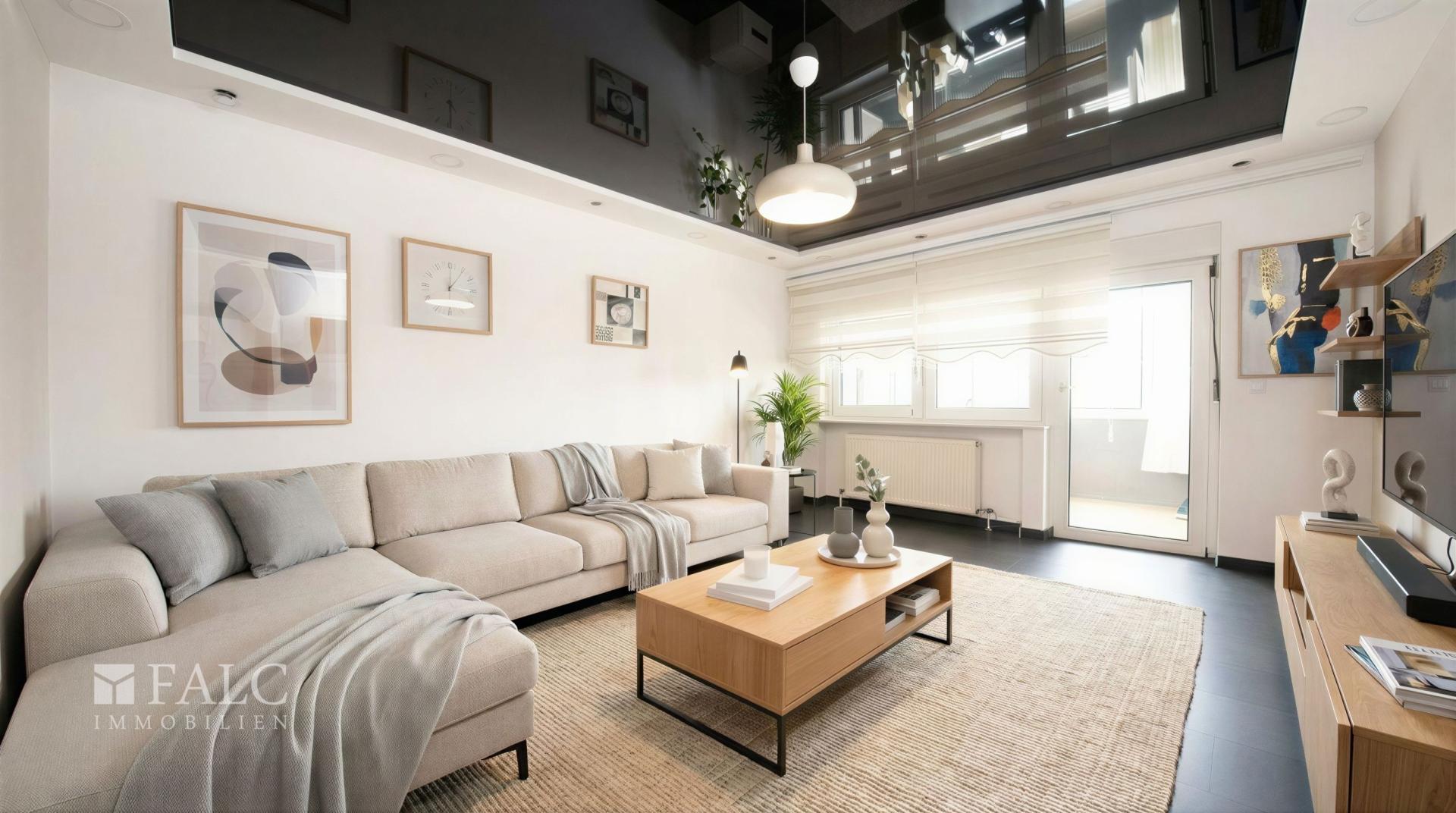 Das Herzstück der Wohnung bildet das lichtdurchflutete ca. 22 m² große Wohnzimmer, das dank weiter Fensterfront mit natürlichem Tageslicht durchflutet wird und eine besonders angenehme Wohnatmosphäre schafft. Der edle schwarze Fliesenboden verleiht dem Raum eine moderne, zugleich elegante Note – ein Gestaltungselement, das sich harmonisch in die angrenzende Küche fortsetzt.