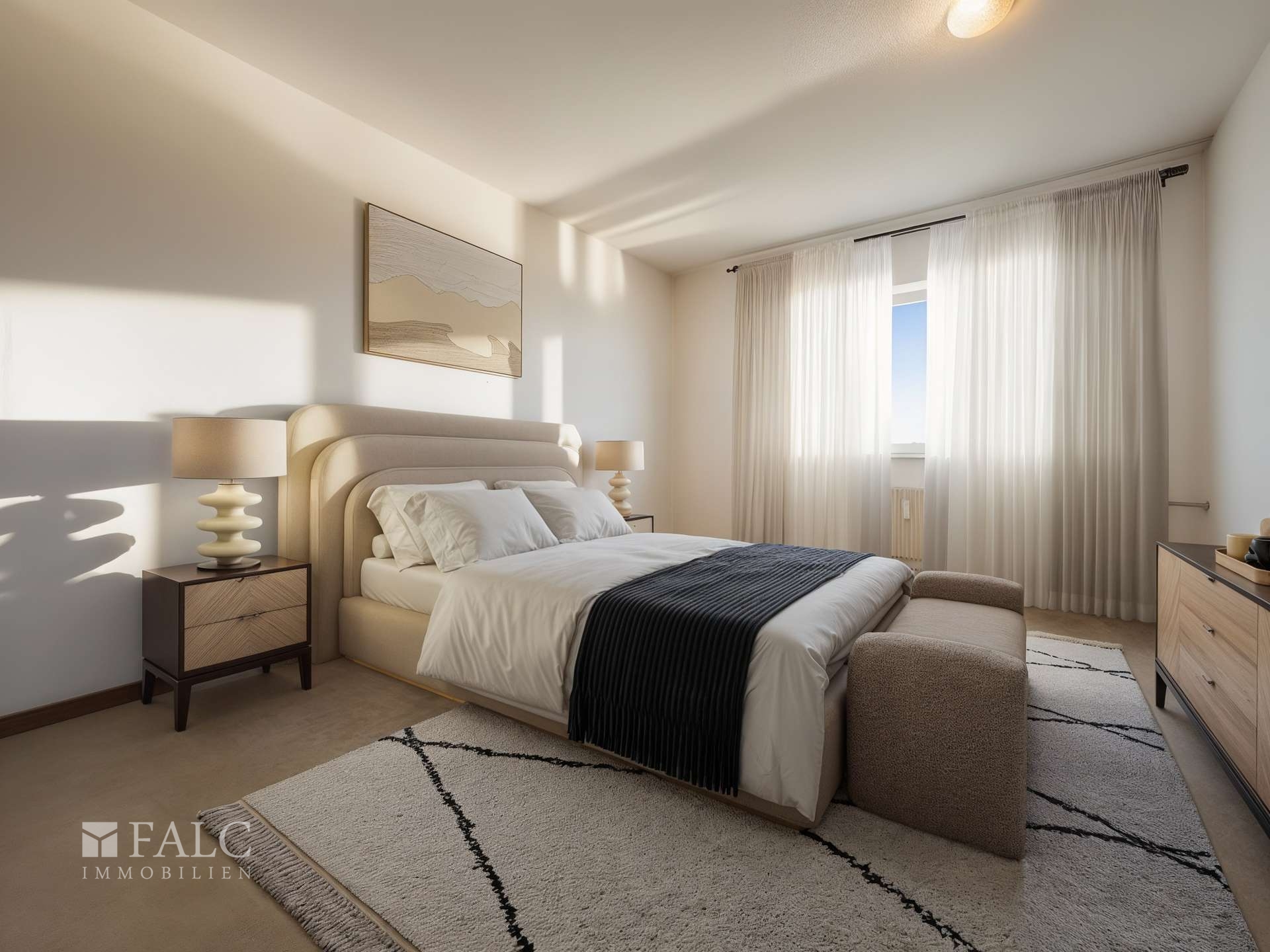 Das Schlafzimmer ist angenehm geschnitten und lässt sich gut möblieren. Das Tageslichtbad mit Fenster sorgt für natürliche Belüftung und Helligkeit.