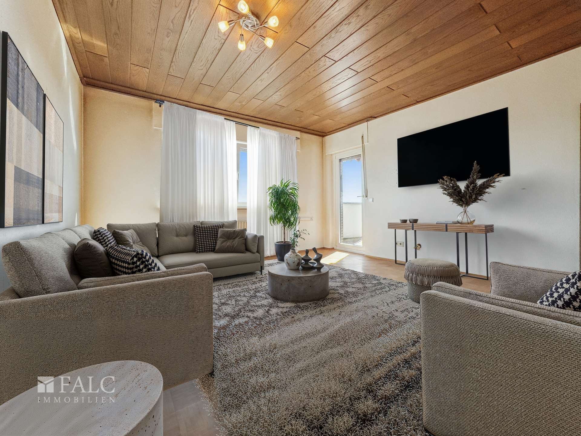 Das Wohnzimmer bildet das Herzstück der Wohnung: gepflegter Parkettboden, großzügige Raumwirkung und der Zugang zur überdachten Loggia, die zu jeder Tageszeit einen anderen Blick bietet – morgens Sonne, abends Ruhe.