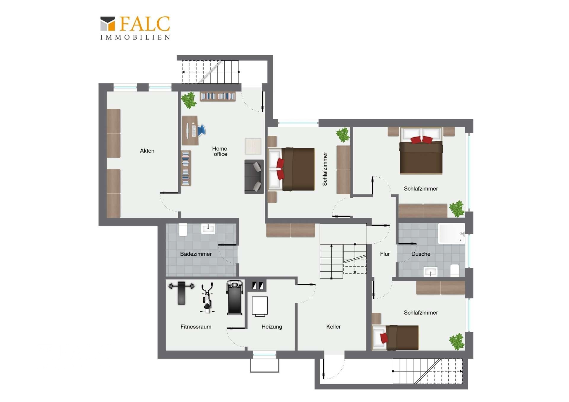 Das Souterrain schließt sich direkt an das Erdgeschoss an und geht fließend in den Kellerbereich über. Zwei helle Schlafzimmer mit Fenstern zum Garten liegen auf der Souterrainseite. Daran angrenzend finden sich im Kellerbereich ein Homeoffice, ein Fitnessraum, ein weiteres Duschbad mit WC sowie Hauswirtschafts- und Abstellflächen. Auch dieser Bereich ist beheizt und bietet dank Deckenhöhe und separatem Zugang zum Garten sowie zur Garage vielfältige Nutzungsmöglichkeiten – ob für Gäste, Arbeiten von zuhause oder als eigener Bereich für Jugendliche oder Pflegepersonal.