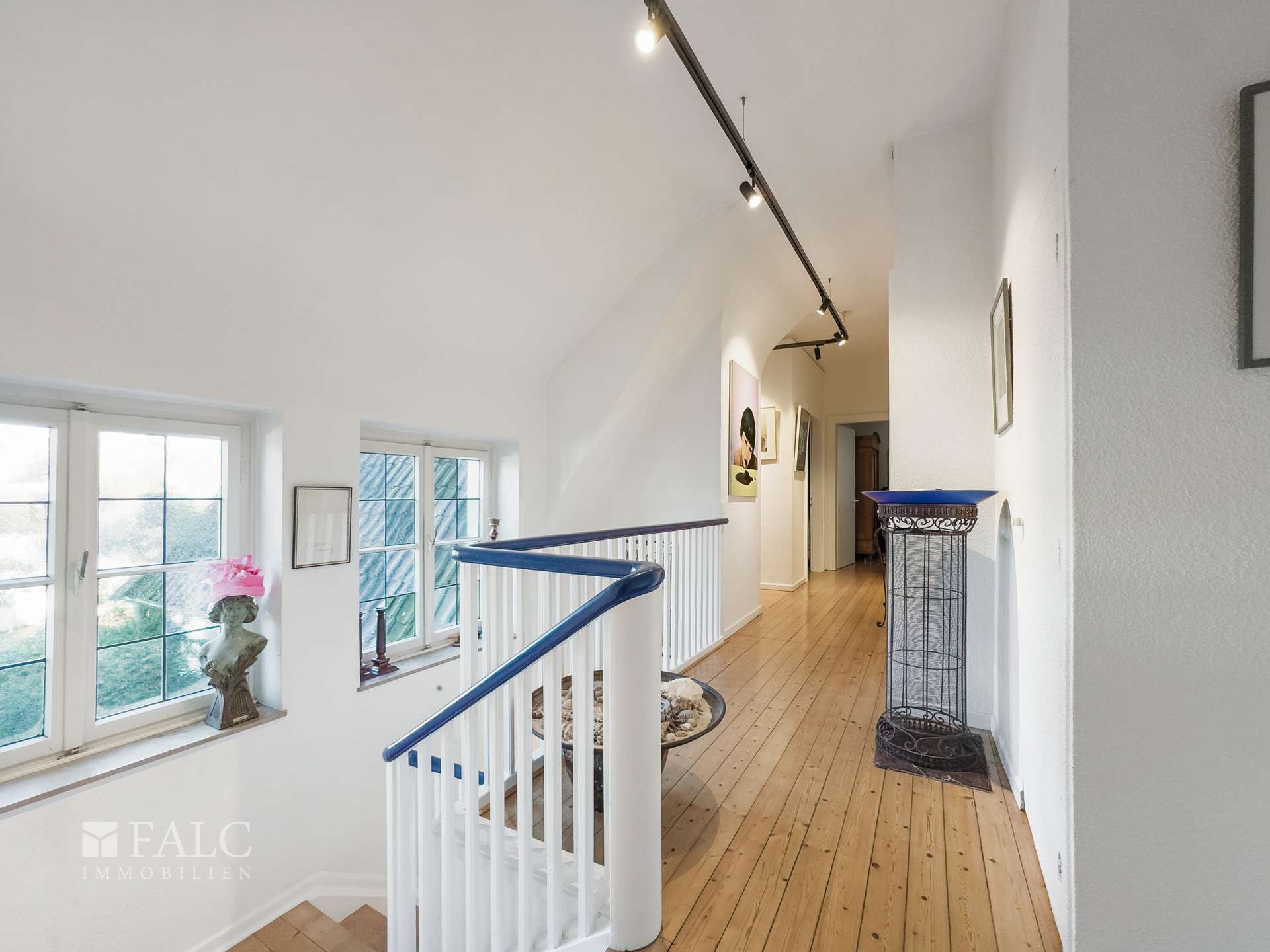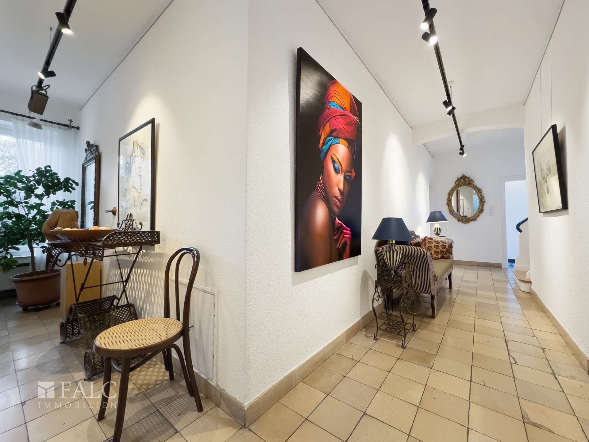 Der zentrale Flur des Hauses ist großzügig, mit Solnhofener Fliesen belegt, und führt geradewegs auf die restaurierte Holztreppe zu – ein Blickfang mit Charakter. Auf der linken Seite öffnet sich der Wohnbereich mit offenem Kamin, schönen Parkettböden, vielen Fenstern mit Blick in den Vorgarten und viel Platz zum Leben. Das angrenzende Verandazimmer kann über eine Schiebetür geöffnet oder abgetrennt werden – je nach Anlass. Von dort aus geht es sowohl auf die überdachte Terrasse und in den Garten als auch direkt in die Küche mit Gartenblick und Sicht auf den Kirchturm von St. Pankratius.